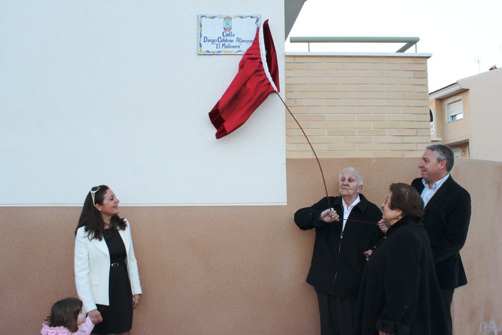 Esta tarde se ha llevado a cabo la inauguración de la calle Diego Celdrán Atiénzar “El Molinero” frente al pabellón de deportes de “La Aceña” en Mazarrón. El Alcalde de Mazarrón y el propio homenajeado, quien ha estado acompañado de familiares y amigos durante el acto, han sido los encargados de destapar la placa que da nombre a la calle. El acto ha contado con la presencia del Teniente alcalde de Urbanismo, Francisco García, y de la Reina Juvenil de las Fiestas Patronales 2012, Ana Cristina Hernández.
