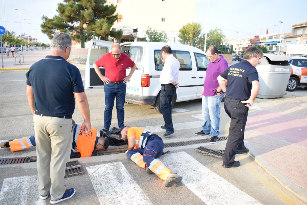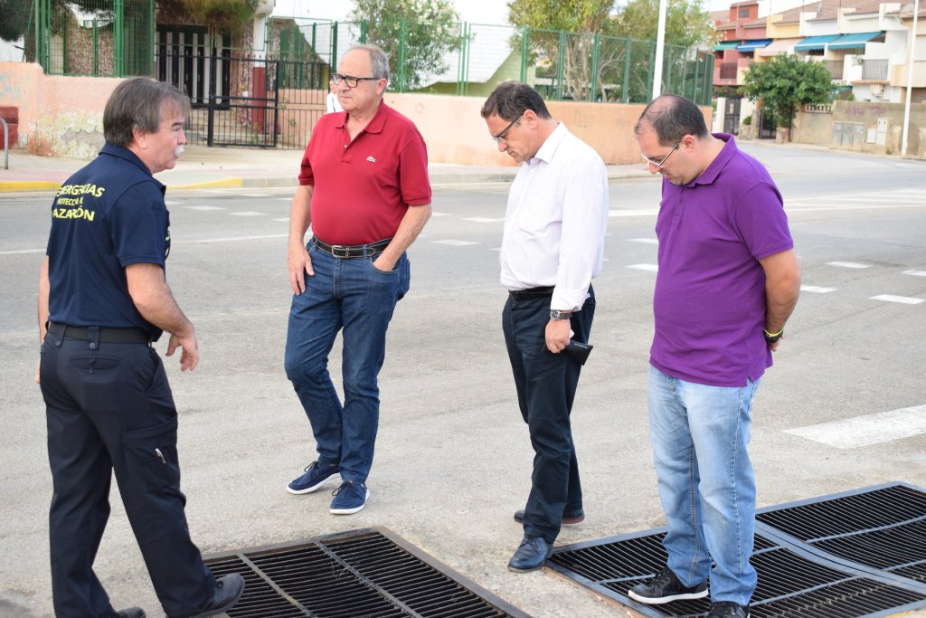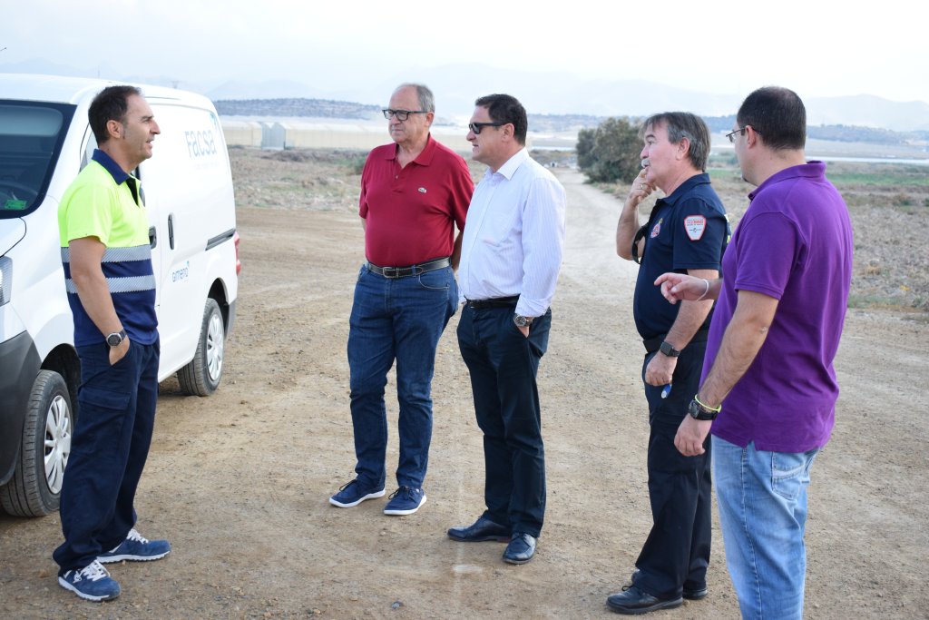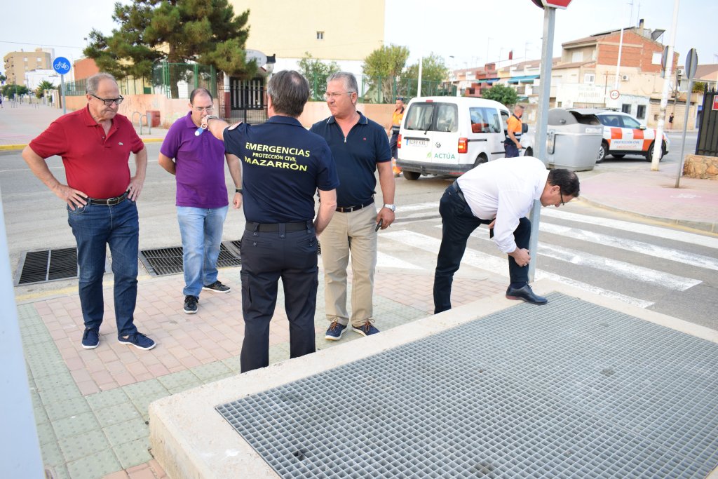 El alcalde de Mazarrón, Gaspar Miras, el concejal de Servicios, Tomás Ureña, y el edil de Protección Civil, Francisco José García, acompañados de operarios municipales y efectivos del área de Protección Civil y SEM; han supervisado personalmente los trabajos esta mañana y se han encargado también de comprobar el estado y funcionamiento de las bombas del colector de Bahía.