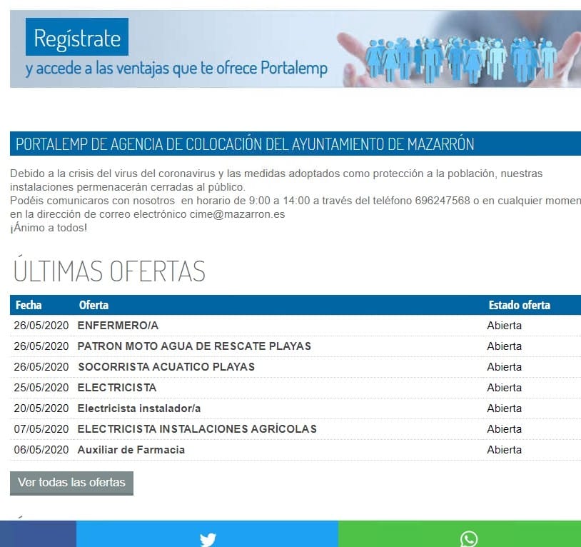 Para consultas pueden escribir a agenciadecolocacion@mazarron.es o llamar al teléfono 696247568Área: Empleo formación y desarrollo local | Fecha: Thu May 28 10:32:22 CEST 2020