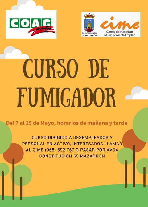 El Centro de Iniciativas Municipales de Empleo (CIME) de Mazarrón oferta un nuevo curso gratuito de Uso Profesional de Productos Fitosanitarios, cuyo nivel estará dedicado a la especialidad de fumigador. Es impartido por COAG y está dirigido a trabajadores del sector agrario, alimentario y forestal