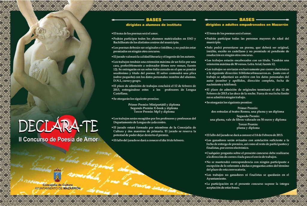 La concejalía de Cultura del Ayuntamiento de Mazarrón ha convocado por segundo año el concurso de poesía amorosa “Declara-Te”, que en esta edición se abre también a los mayores de edad con una convocatoria específica para ellos. Este concurso se encuadra dentro de la campaña de animación a la lectura que promueven las bibliotecas municipales de Mazarrón y Puerto y, en ambas convocatorias, el tema sobre el que deberán girar los trabajos que se presenten será el amor.