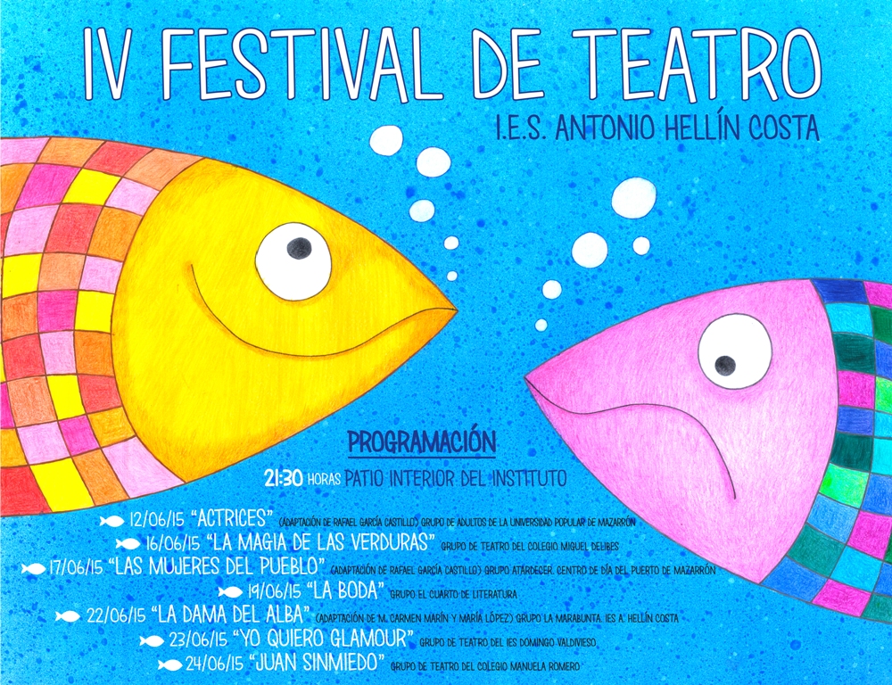 Abre la programación el viernes 12 de junio el grupo de adultos de la Universidad Popular de Mazarrón con la adaptación de “Actrices”, realizada por Rafael García Castillo. Continuará el martes 16 de junio el grupo de teatro del Colegio Miguel Delibes con la representación de “La magia de las verduras”. Un día más tarde, el miércoles 17 de junio actuará el Grupo Atardecer del Centro de Día de Puerto de Mazarrón escenificando la obra “Las mujeres del pueblo”, adaptada por Rafael García Castillo. El viernes 19 de junio será el turno para el grupo “El Cuarto de Literatura” con “La boda”. El lunes 22 de junio “La Marabunta” del IES Antonio Hellín interpretará “La dama del alba”, obra premiada recientemente en Murcia. El grupo de teatro del IES Domingo Valdivieso escenifica “Yo quiero Glamour”, el martes 23 de junio. Cerrarán el IV Festival de Teatro los alumnos del Colegio Manuela Romero con la obra “Juan Sin Miedo”.