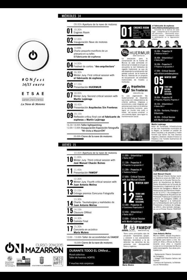 #ONfest tendrá lugar en la Nave de los Motores del Campus Alfonso XIII de Cartagena los días 14 y 15 de enero. Una exposición mostrará las fotografías que los alumnos realizaron durante una de sus visitas al municipio objeto de estudio. El jueves 15 de enero, el alcalde de Mazarrón, Francisco García, procederá a la entrega de premios del citado concurso.