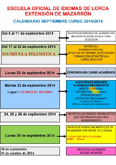 El Colegio Miguel Delibes de Puerto de Mazarrón es un año más la sede en nuestro municipio de la Escuela Oficial de Idiomas de Lorca. El próximo lunes acaba el periodo de matrícula telemática y comienza el nuevo curso y el martes 23 tendrá lugar la elección de horario del alumnado preinscrito para los niveles básico e intermedio. Para este trámite es imprescindible llevar el DNI o Pasaporte y la autorización firmada.