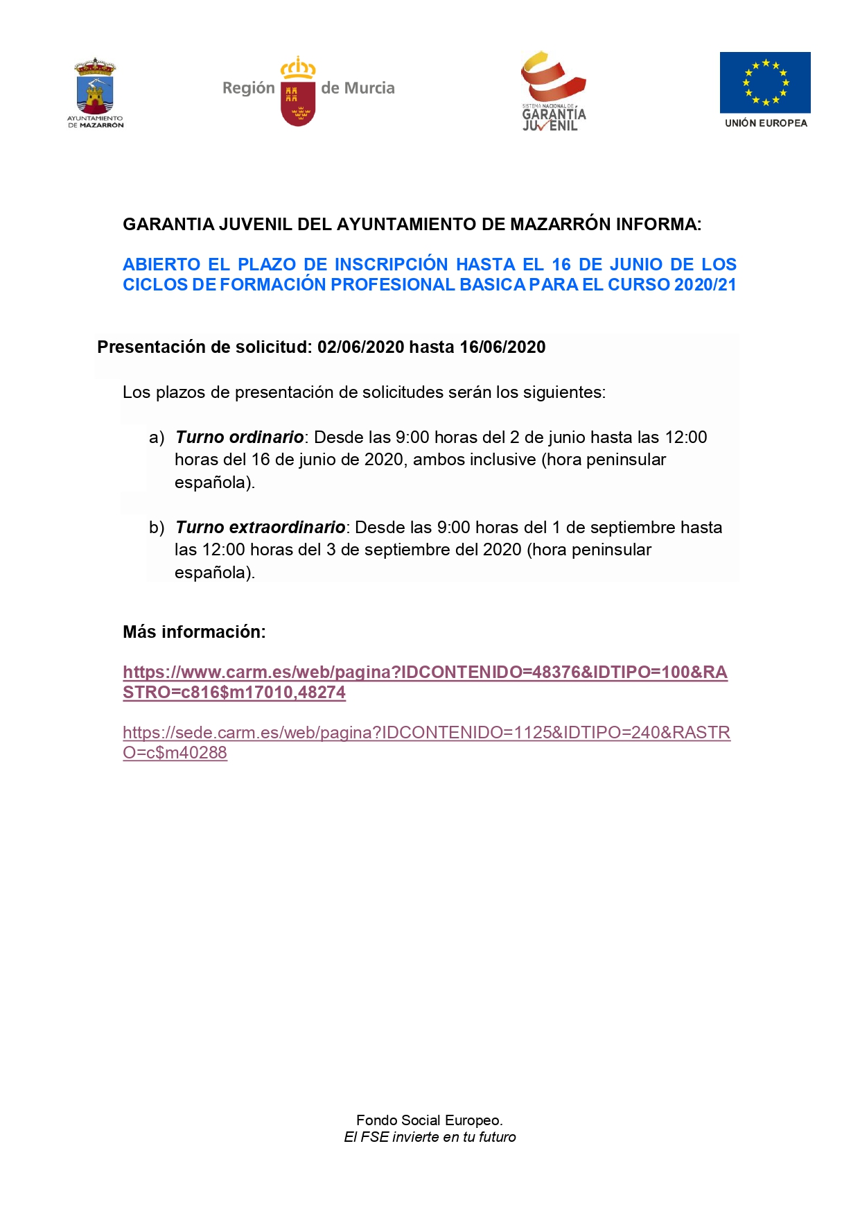 GARANTIA JUVENIL DEL AYUNTAMIENTO DE MAZARRÓN INFORMA: