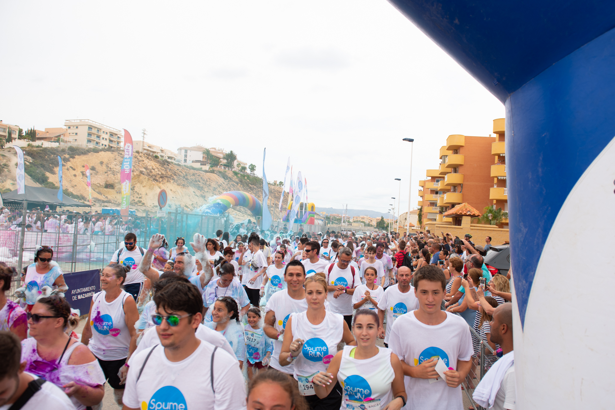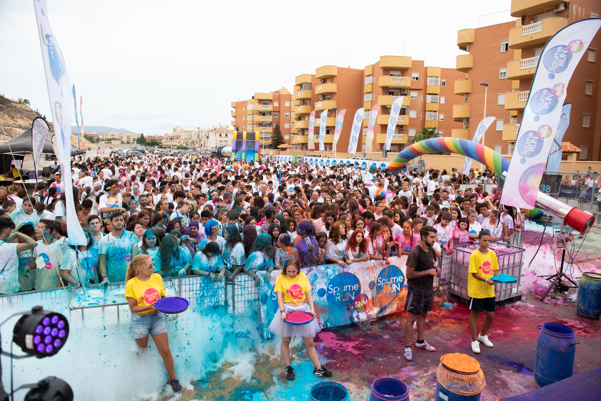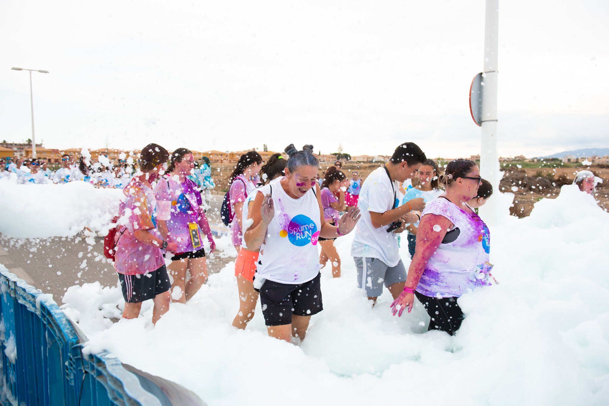 Más de 1.800 personas participaron este sábado en la tercera edición de la carrera de espuma de colores Spume Run de Puerto de Mazarrón. A las 7 de la tarde del pasado sábado se daba la salida desde la explanada del mercadillo municipal. Por delante esperaban cinco kilómetros con cañones de espuma a cada kilómetro, también llamados spumepoints. Cada uno de ellos lanzaba espuma de un color diferente (rosa, amarillo, azul y verde) al paso de los participantes.