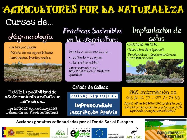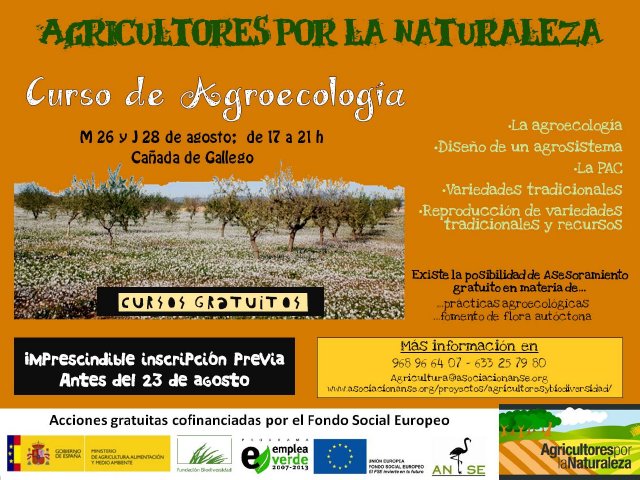 La Asociación de Naturalistas del Sureste pone en marcha un curso sobre Agroecología en Cañada de Gallego (Mazarrón), que se celebrará las tardes del martes 26 y jueves 28 de agosto, en horario de 17 a 21 horas. La primera jornada será teórica y la segunda, práctica. La inscripción previa es imprescindible, siendo el plazo hasta el sábado 23 de agosto.