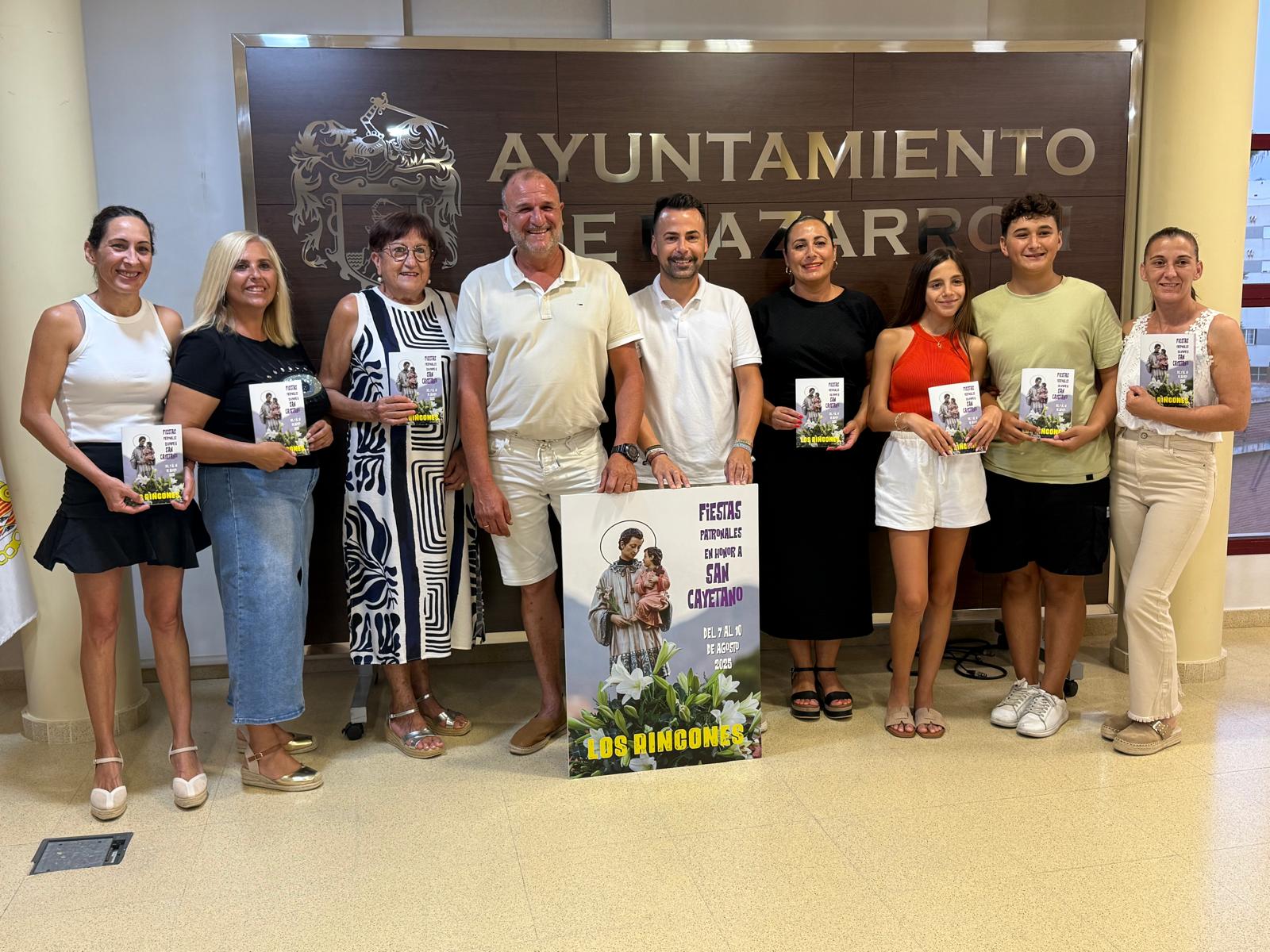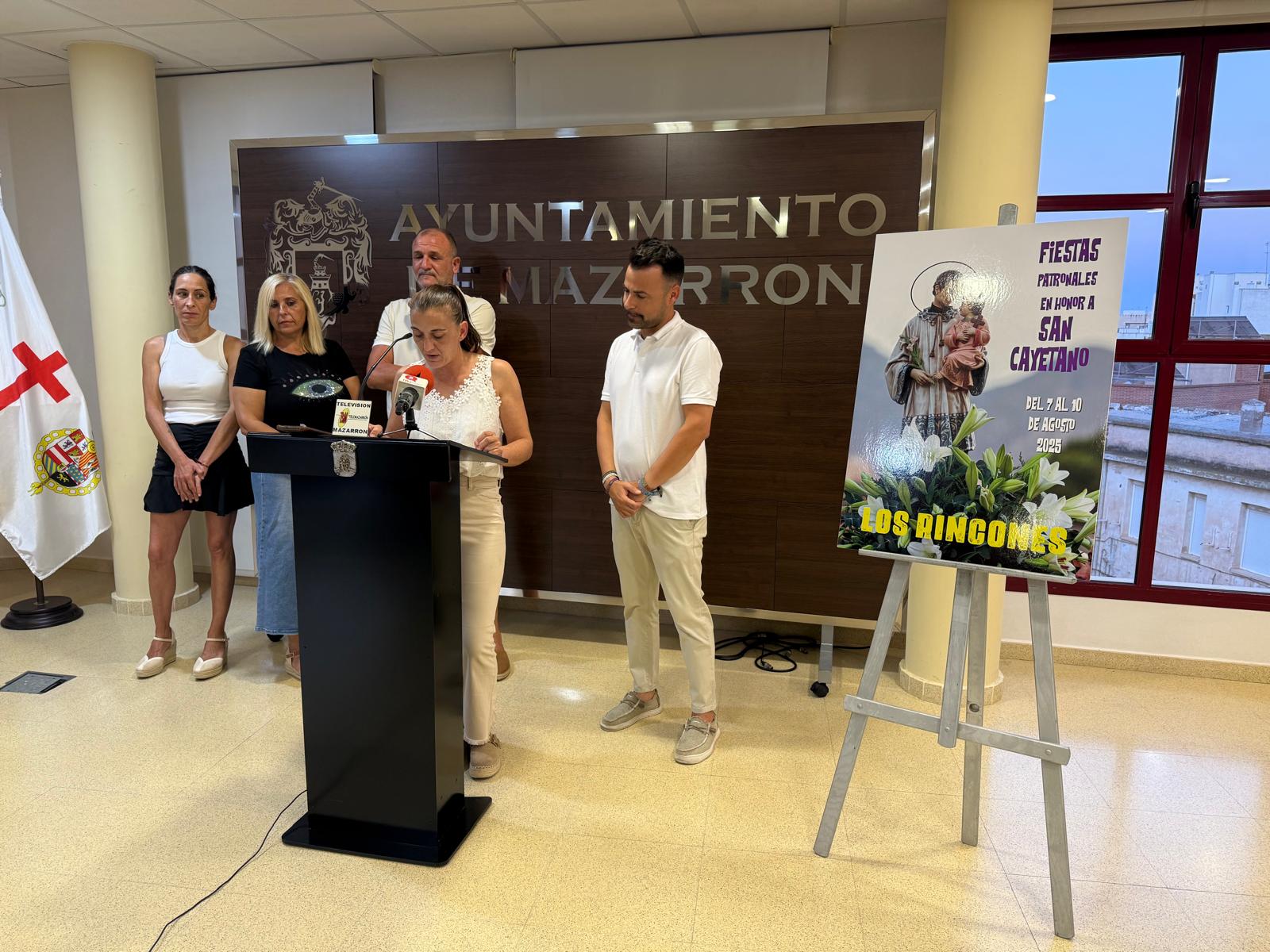 El concejal de festejos, Miguel Ángel Peña, acompañado por miembros de la asociación vecinal y el pregonero de este año D. Francisco Daniel Blaya Agüera, anunció el pasado viernes en rueda de prensa la programación y el cartel de las fiestas de San Cayetano 2025, de la pedanía mazarronera de Los Rincones. Estas fiestas han sido organizadas por la concejalía de Festejos, junto con la comisión de fiestas, formada por Salvadora, Vanesa y Ana, y en colaboración con Juan Carlos López, concejal de Participación Ciudadana.