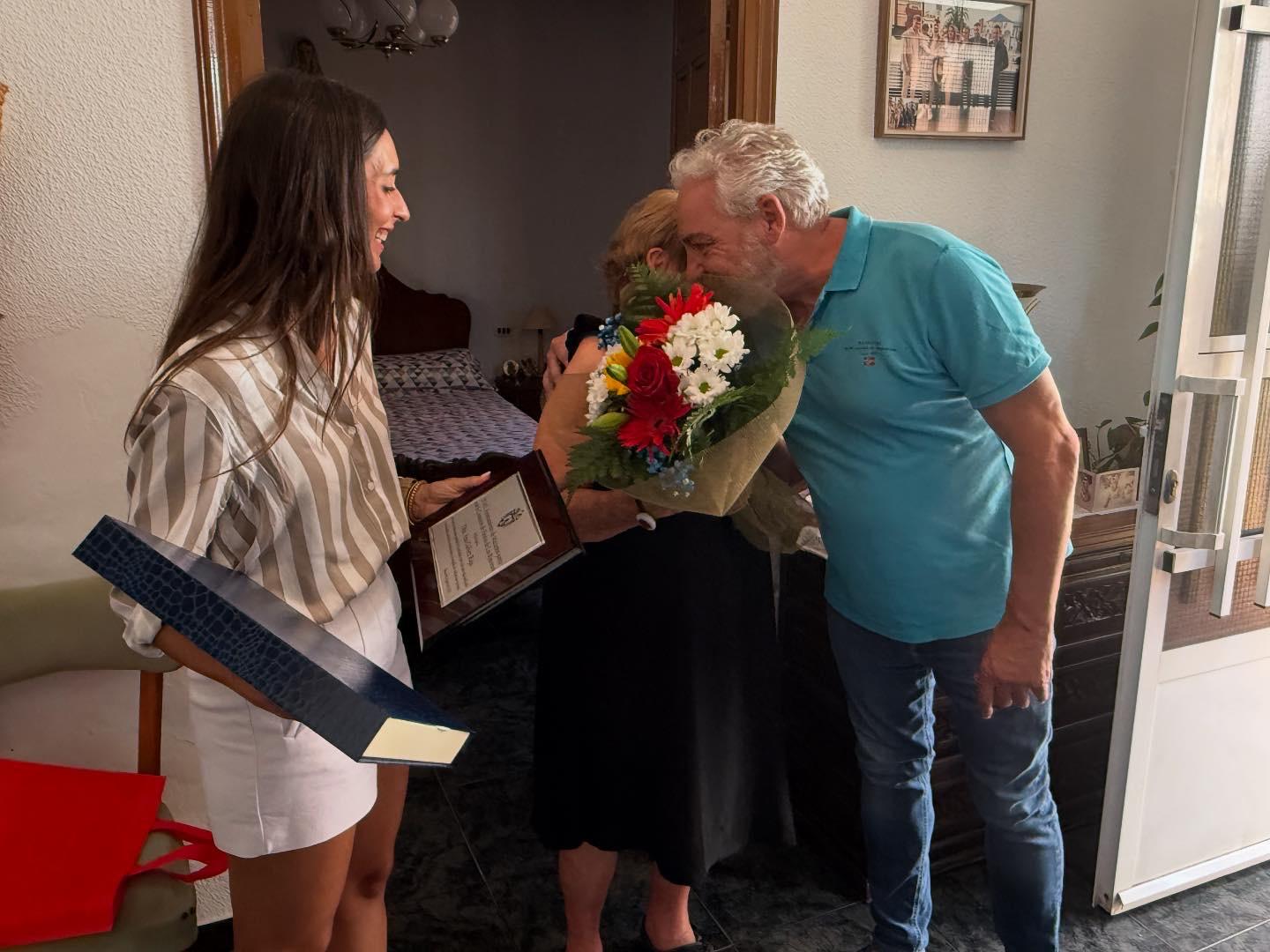 Durante la mañana de ayer, en un ambiente emotivo y familiar, doña Ana fue sorprendida por la visita de nuestro alcalde, Ginés Campillo, quien le hizo entrega de un ramo de flores acompañado por Silvia García, concejal de Mayores, que le concedía la placa conmemorativa que la reconoce como Persona Mayor de Los Rincones 2025.