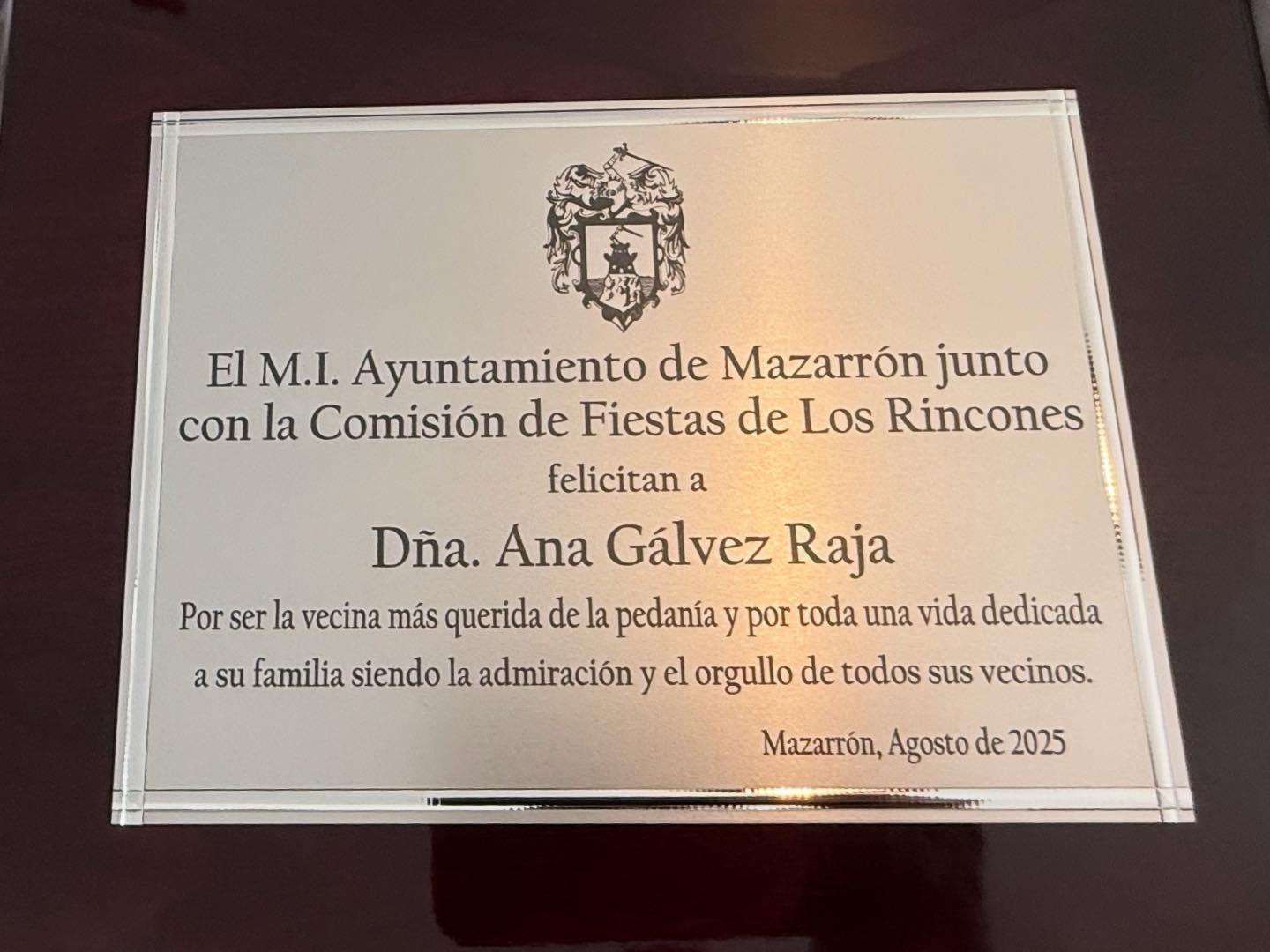 En el marco de las fiestas patronales de Los Rincones en honor a San Cayetano, el Ayuntamiento de Mazarrón ha rendido homenaje a doña Ana Gálvez Raja, reconocida este año como Persona Mayor de la pedanía.