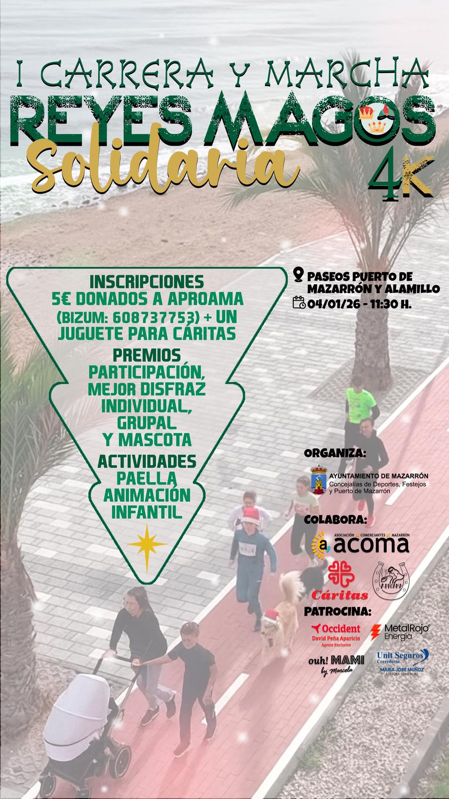El Ayuntamiento de Mazarrón, a través de las concejalías de Deportes, Festejos y Puerto de Mazarrón, y la Asociación de Comerciantes de Mazarrón (ACOMA), ha presentado la I Carrera y Marcha Solidaria Reyes Magos 4K, una iniciativa deportiva y solidaria que se celebrará el próximo 4 de enero de 2026, a partir de las 11:30 horas, en los paseos del Puerto de Mazarrón y El Alamillo.