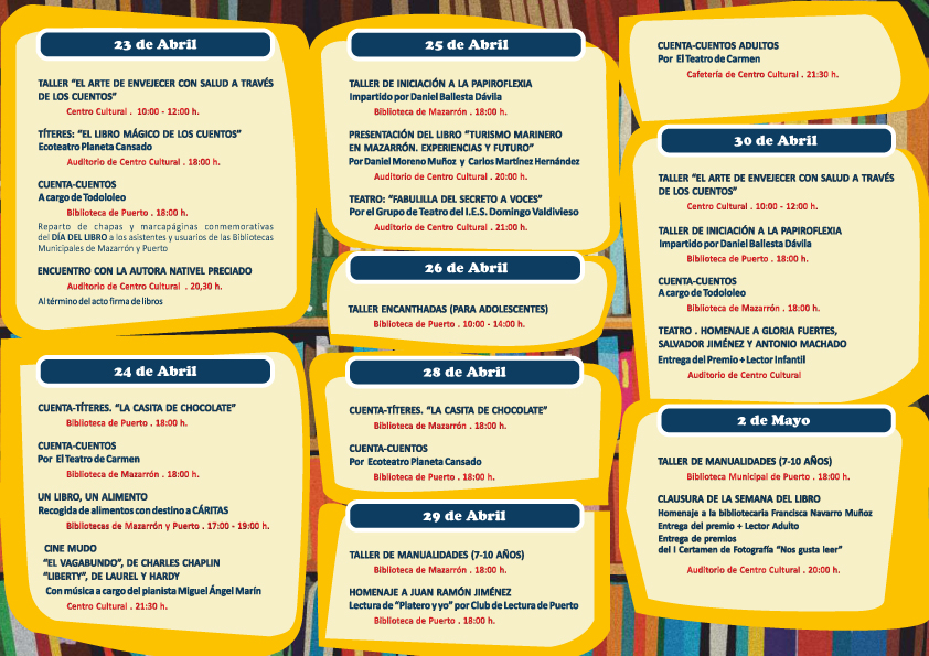 Además de estas actividades, Soria destacó que “el día 23 de abril, cuando se conmemora el ‘Día del Libro’, contaremos con la presencia de la escritora y periodista Nativel Preciado, quien mantendrá un encuentro con sus lectores a partir de las 8 y media de la tarde en el salón de actos del Centro Cultural de Mazarrón donde también firmará libros a todos aquellos que lo deseen”. La edil de Cultura también ha llamado a los vecinos a participar en “la recogida de alimentos con destino a Cáritas con la que el jueves 24, de 17 a 19 horas en las bibliotecas de Mazarrón y Puerto, cambiaremos alimentos por libros”.