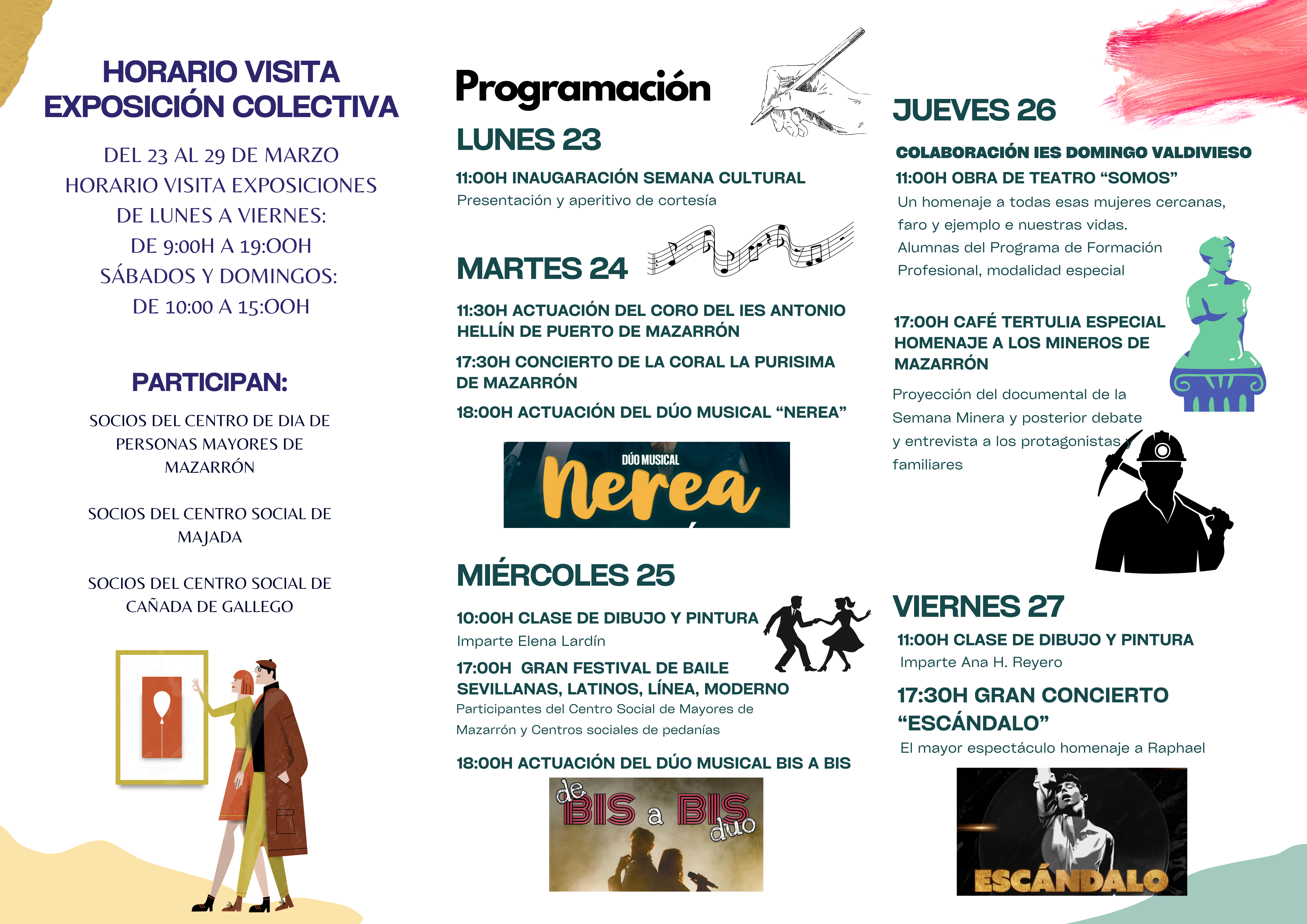 Durante toda la semana, vecinos y visitantes podrán disfrutar de propuestas culturales y de ocio que incluyen exposiciones colectivas, actuaciones musicales y talleres. Entre los eventos destacados se encuentran la actuación del I.E.S. Antonio Hellín de Puerto de Mazarrón, así como la participación del Dúo Musical “Bis a Bis”, que pondrá ritmo a una de las jornadas.