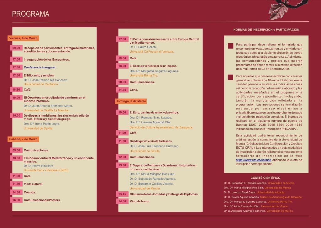 Así, el Nilo, asociado al mito y a la religión, El Orontes, por su encrucijada de caminos en Oriente Próximo, El Ródano, entre el Mediterráneo y un continente masivo, el Po, por su conexión entre Europa Central y el Mediterráneo, El Tíber, como eje vertebrador de un imperio, el Ebro, como camino de remo, vela y sirga; el Guadalquivir, río de tartesos, los ríos de la mitología griega y finalmente el Segura; serán los ríos protagonistas de las conferencias que llegarán de voz de especialistas de universidades como las de Cantabria, Castilla La Mancha, Sevilla, Paris-Nanterre, Ca’Foscari de Venezia, Roma Tre y Murcia, así como del Servicio de Cultura del Ayuntamiento de Zaragoza.