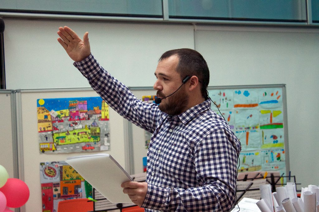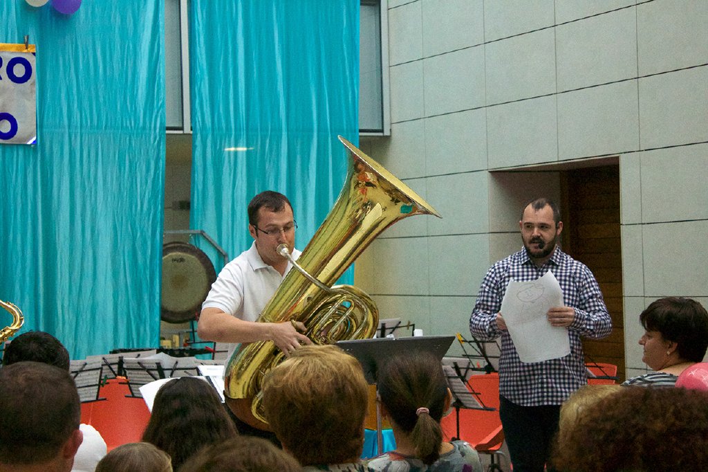 El narrador y presentador del concierto fue Juan José Miñarro, quien comenzó con un simulacro del concurso ‘Tú sí que vales’, en el que los finalistas eran los instrumentos que debían interpretar a los personajes del cuento. El público infantil participó como jurado levantando un globo verde si estaba de acuerdo, o uno rojo si no lo estaba. Con la ayuda de los niños y niñas del público, el presentador asignó a la flauta travesera el papel se pájaro, al oboe el pato, al clarinete el gato y a la tuba el abuelo.