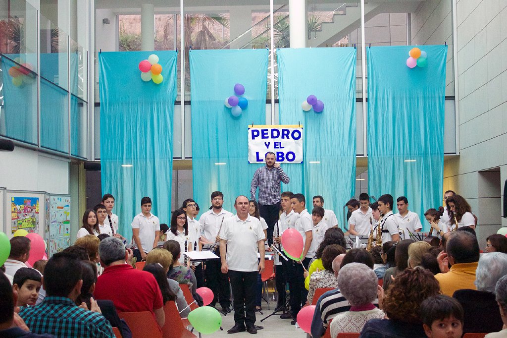 Presentados así estos cuatro personajes, aún faltaba el lobo, papel correspondiente a las trompas que comenzaron a sonar antes de aparecer por detrás del escenario; Pedro, el niño protagonista, se le asignó al saxofón “que había resultado perdedor en el concurso y estaba triste” y los cazadores representados por la percusión que sonó con contundencia. Una vez asignados los personajes, todos los músicos ocuparon sus asientos y el narrador hizo una breve presentación de los instrumentos y de los personajes, al tiempo que sonaba la melodía asociada a cada uno de ellos.