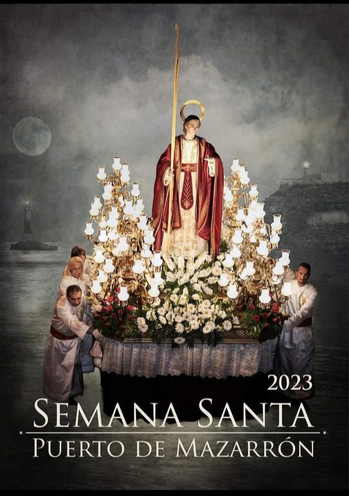 En esta nueva Semana Santa, la imagen protagonista de la obra anunciadora es San Juan Evangelista, sagrado titular que da nombre a la Cofradía encargada de organizar este año la gran semana porteña. Obra de la fotógrafa local Tere López, la composición retrata cómo el discípulo amado, empujado por sus cofrades, llega a la orilla del Puerto de Mazarrón con la primera luna llena de primavera al fondo y La Galerica y el imponente faro cerrando la imagen por sus márgenes izquierdo y derecho, respectivamente.