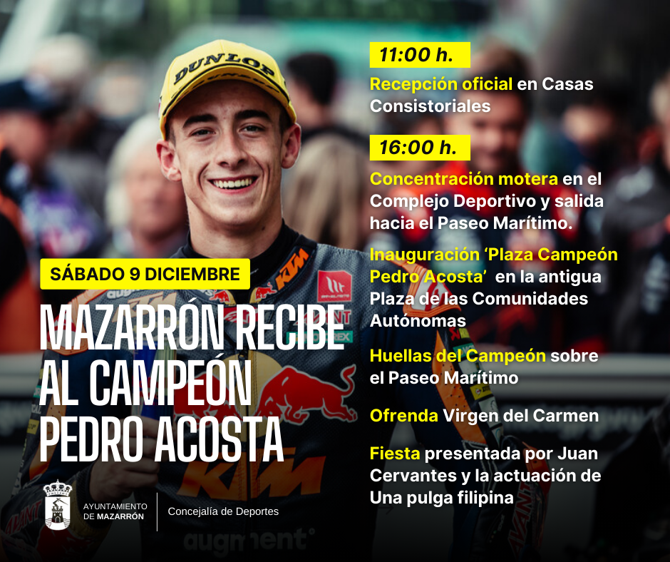 Este próximo sábado 9 de diciembre, Mazarrón se vestirá de gala para recibir con entusiasmo y orgullo a su ilustre vecino, el piloto Pedro Acosta, flamante Campeón del Mundo de Moto2. Los mazarroneros se preparan para rendir homenaje a este joven talento que ha llevado el nombre del municipio a lo más alto del motociclismo mundial.