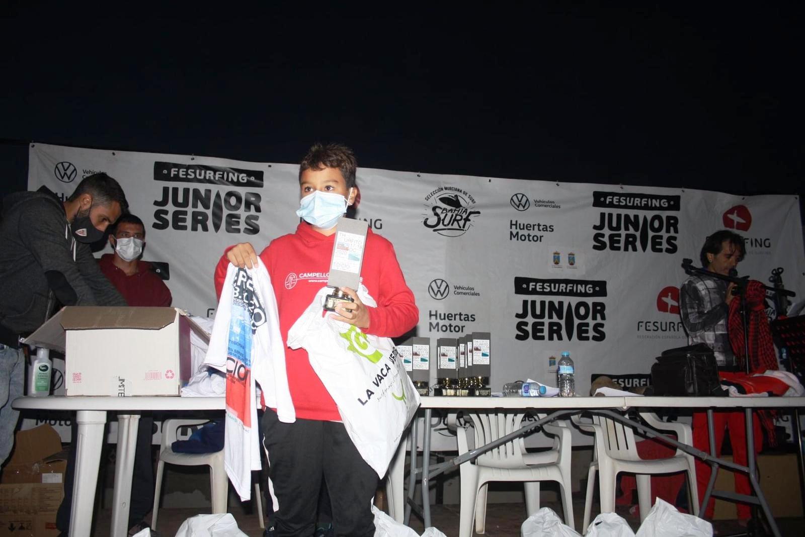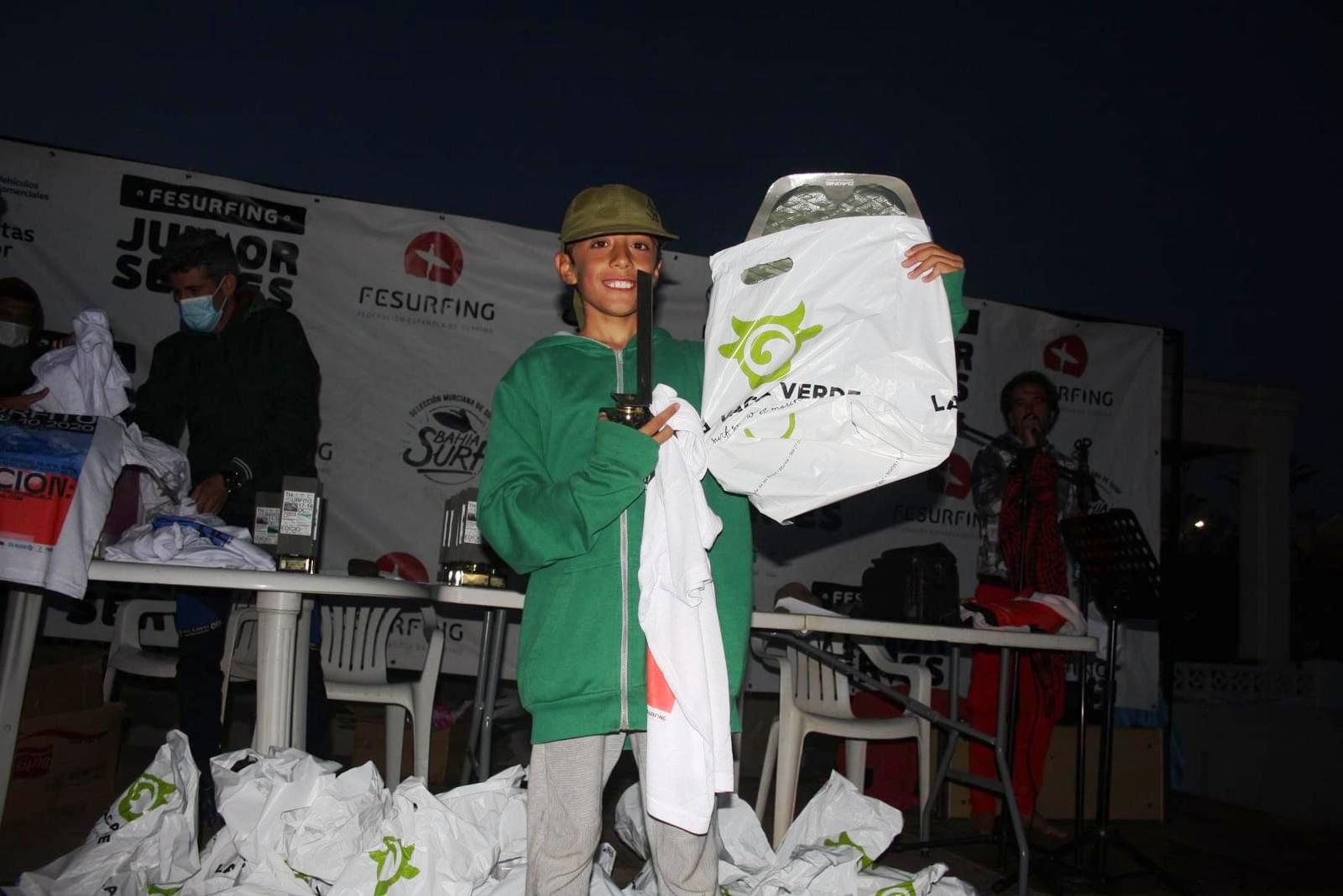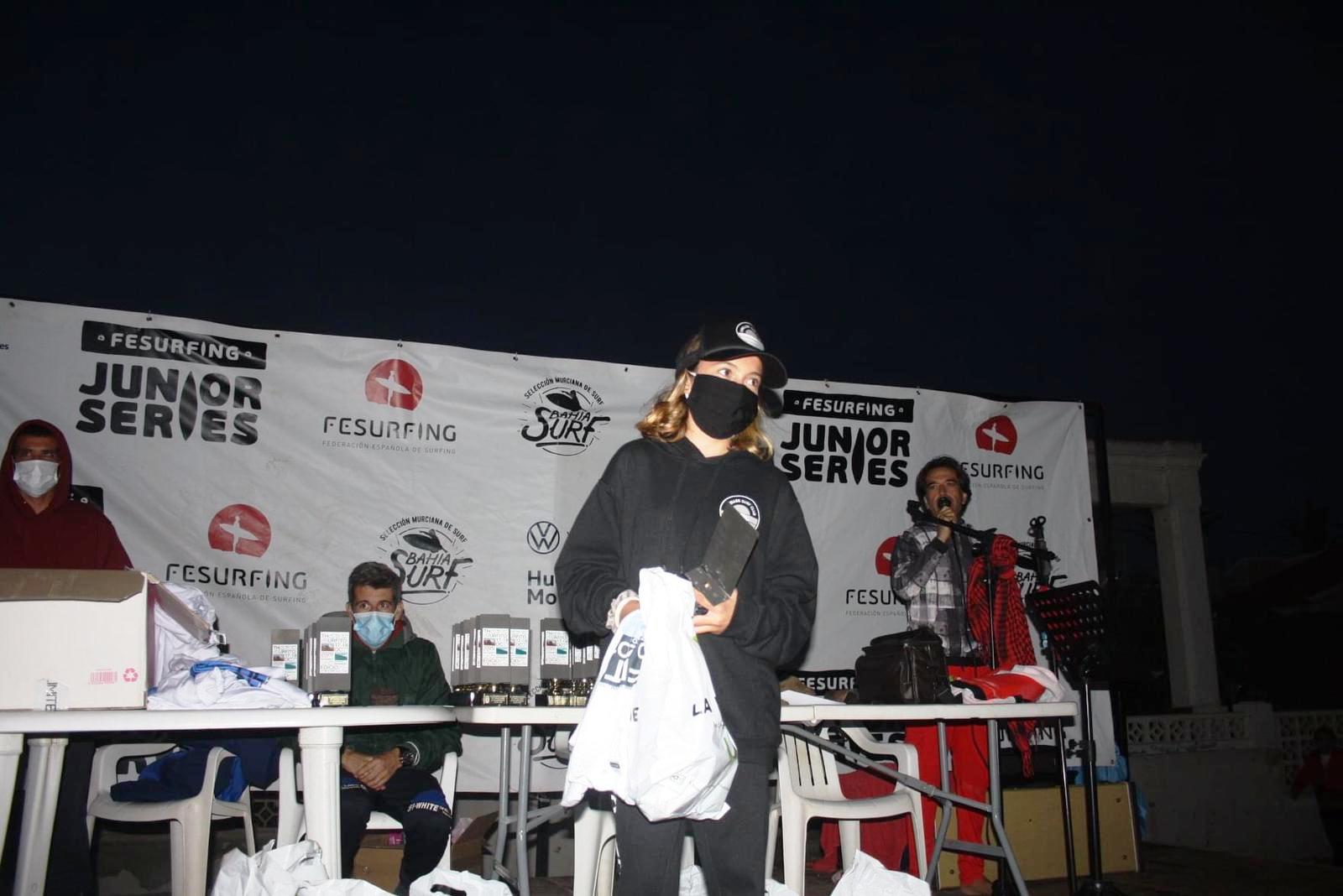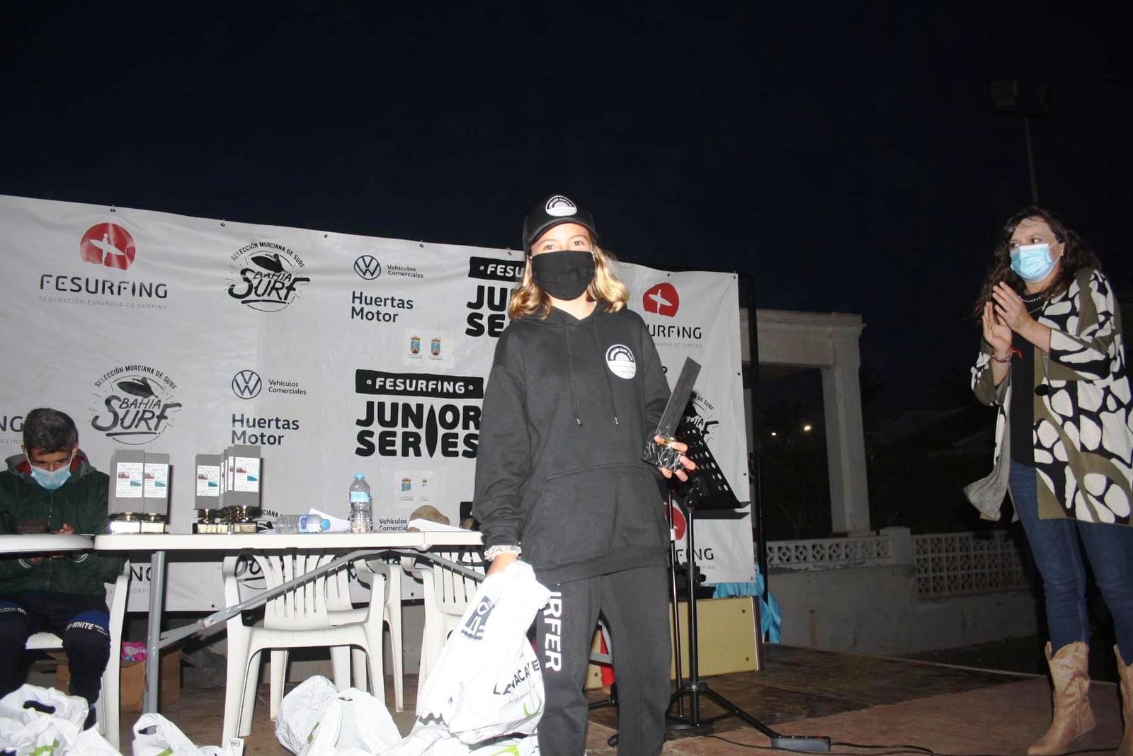 Tras la finalización de la prueba, que contó con todas las medidas de seguridad ante la Covid19, se procedió a la entrega de trofeos por parte del concejal de Deportes, Francisco José García, el presidente del Club Deportivo ‘Bahía Surf’, José María Cascales, y la edil de Medio Ambiente, Plácida Gómez.