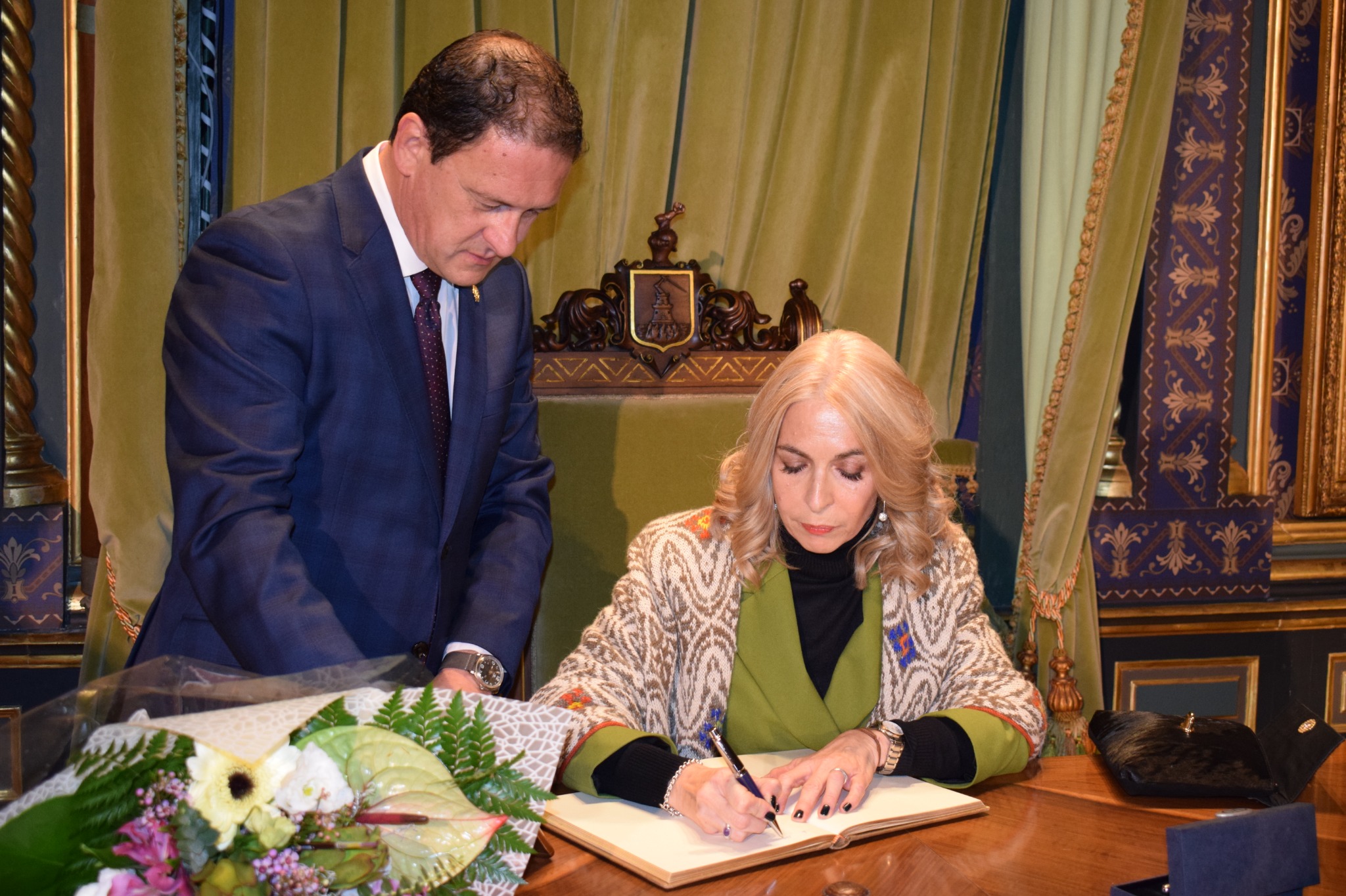 Minutos antes del pregón, Isabel Guillermo fue recibida en el Salón de Plenos de las Casas Consistoriales por la práctica totalidad de la Corporación Municipal. Allí firmó en el libro de honor del Ayuntamiento, como es tradición que hagan todos los pregoneros, y recibió una sorpresa en forma de regalo muy especial de manos del alcalde. El obsequio era una copia de una noticia con un dibujo de la pregonera aparecida en un periódico escolar en el que se anunciaba que Isabel Guillermo había sido premiada en un concurso de dibujo en el año 1980 y que se guarda en el Archivo Municipal de Mazarrón. Una obra que la archivera municipal, Magdalena Campillo, rescató para esta ocasión tan especial.