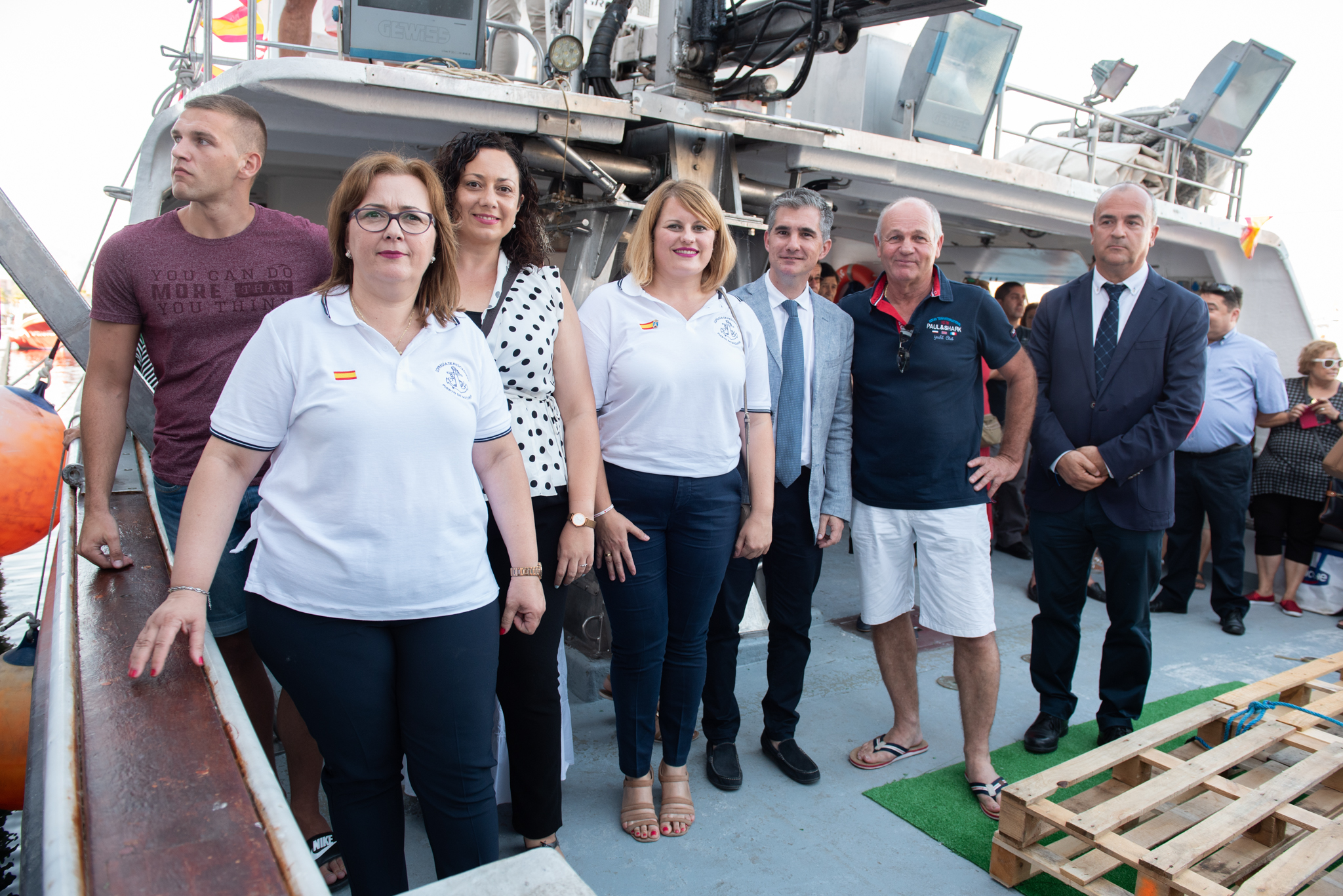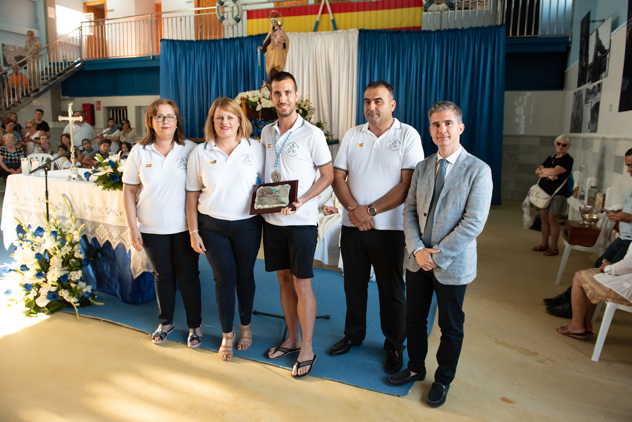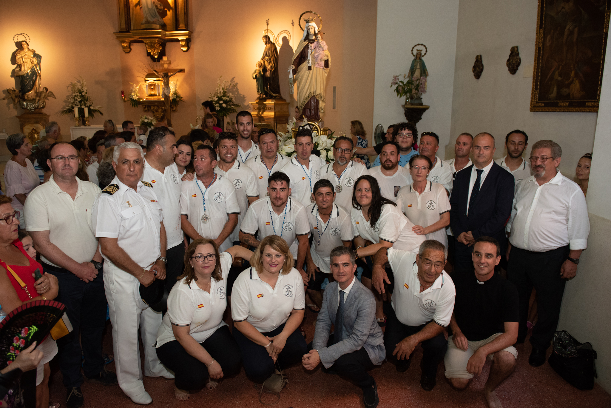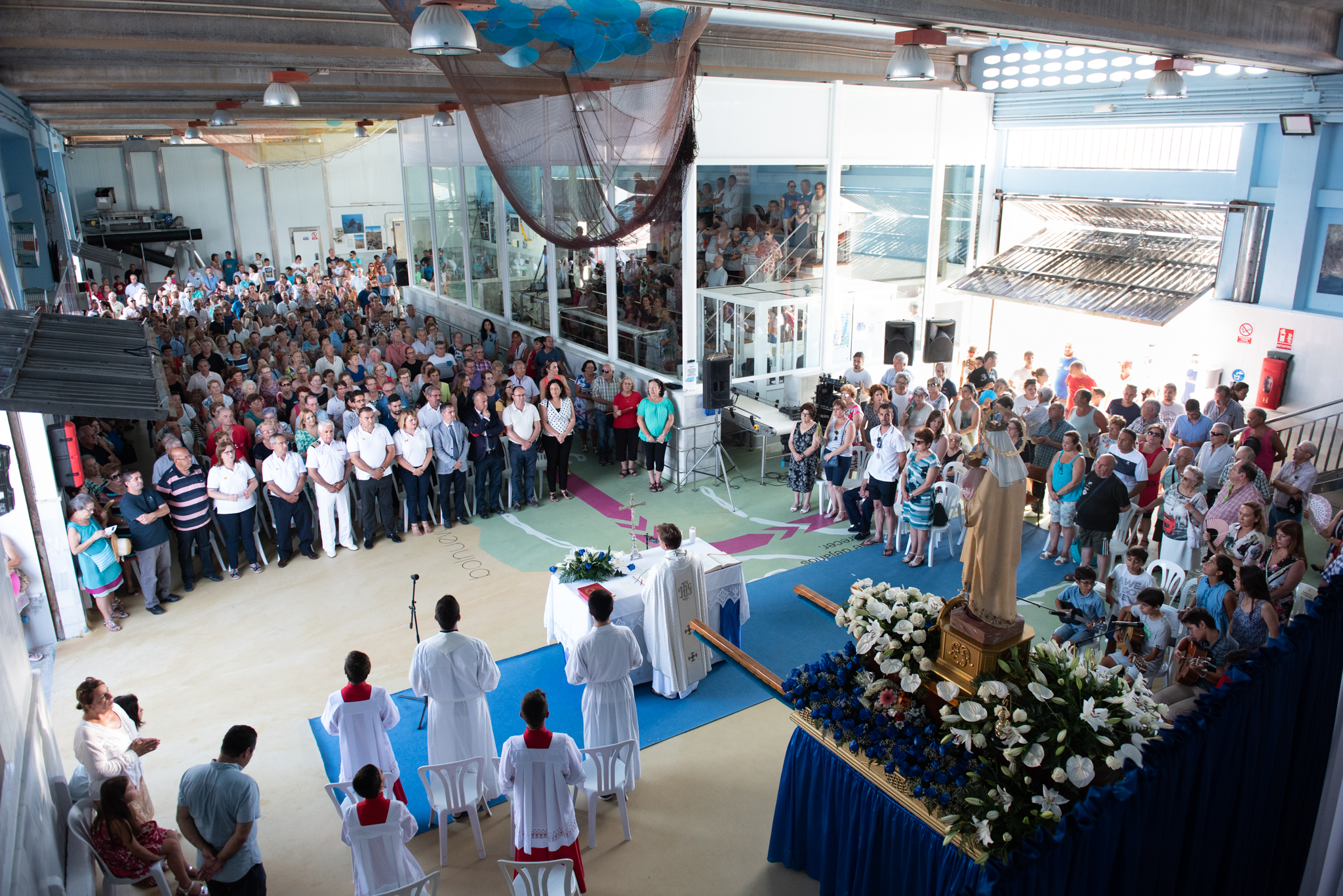 Lleno en la Lonja para presenciar los oficios religiosos con presencia del consejero de Agua, Agricultura, Ganadería y Pesca, Miguel Ángel del Amor, acompañado por la alcaldesa de Mazarrón, Alicia Jiménez y por el patrón mayor de la Cofradía de Pescadores, Manuel Sánchez, entre otras autoridades civiles y militares. El barco “Los Picones” tuvo este año el honor de portar la imagen de la Virgen durante un trayecto que tuvo que ser modificado debido al estado del mar, dirigiéndose las embarcaciones hacia La Azohía y no hacia Bolnuevo, como de costumbre.