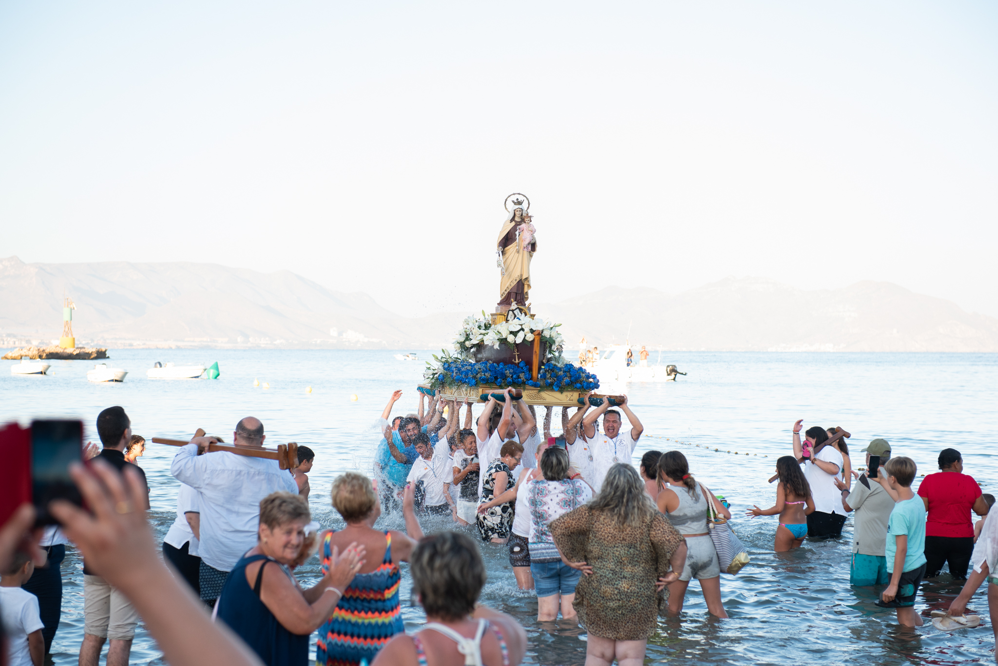 Ya en tierra la imagen fue portada a hombros por los pescadores desde el muelle pesquero hasta el Paseo Marítimo donde esperaban centenares de personas quienes presenciaron como la imagen era llevada a la playa, adentrándose unos metros en el agua, ofreciendo estampas de bella factura.