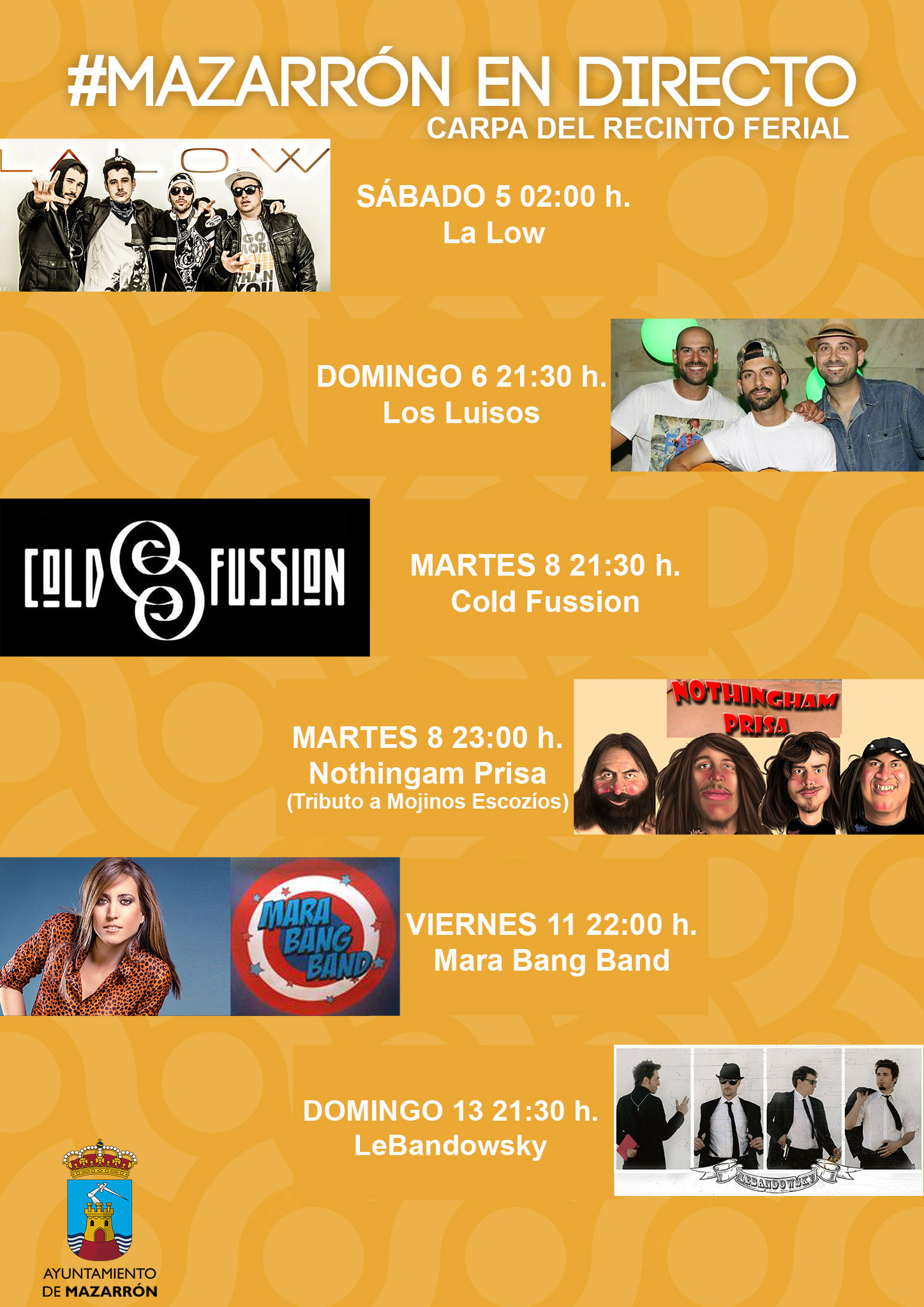 Patricio Sánchez, concejal de Festejos, ha animado a los mazarroneros a que disfruten de la música de los grupos de su tierra. “Hemos intentado tener en cuenta el estilo de cada grupo y el público que abarca para intentar agradar al mayor número de grupos de edad”. Todos los conciertos son gratuitos y se desarrollarán en la Carpa Municipal Camino de los Rincones.