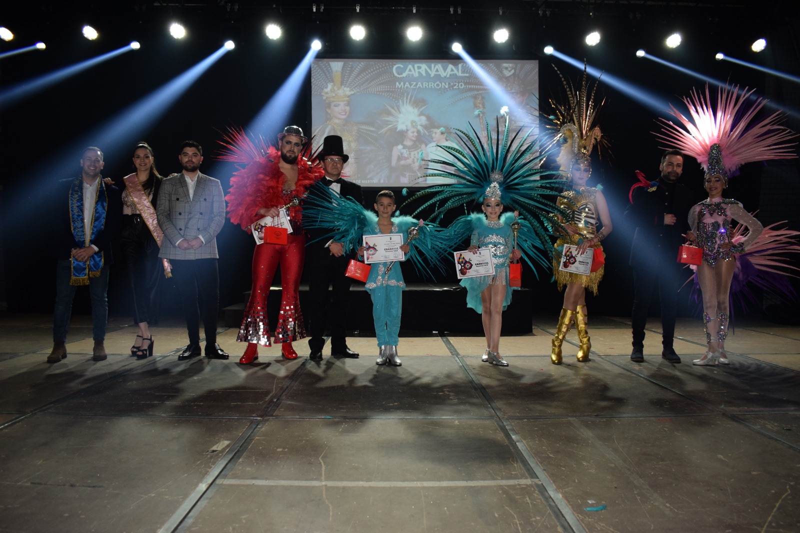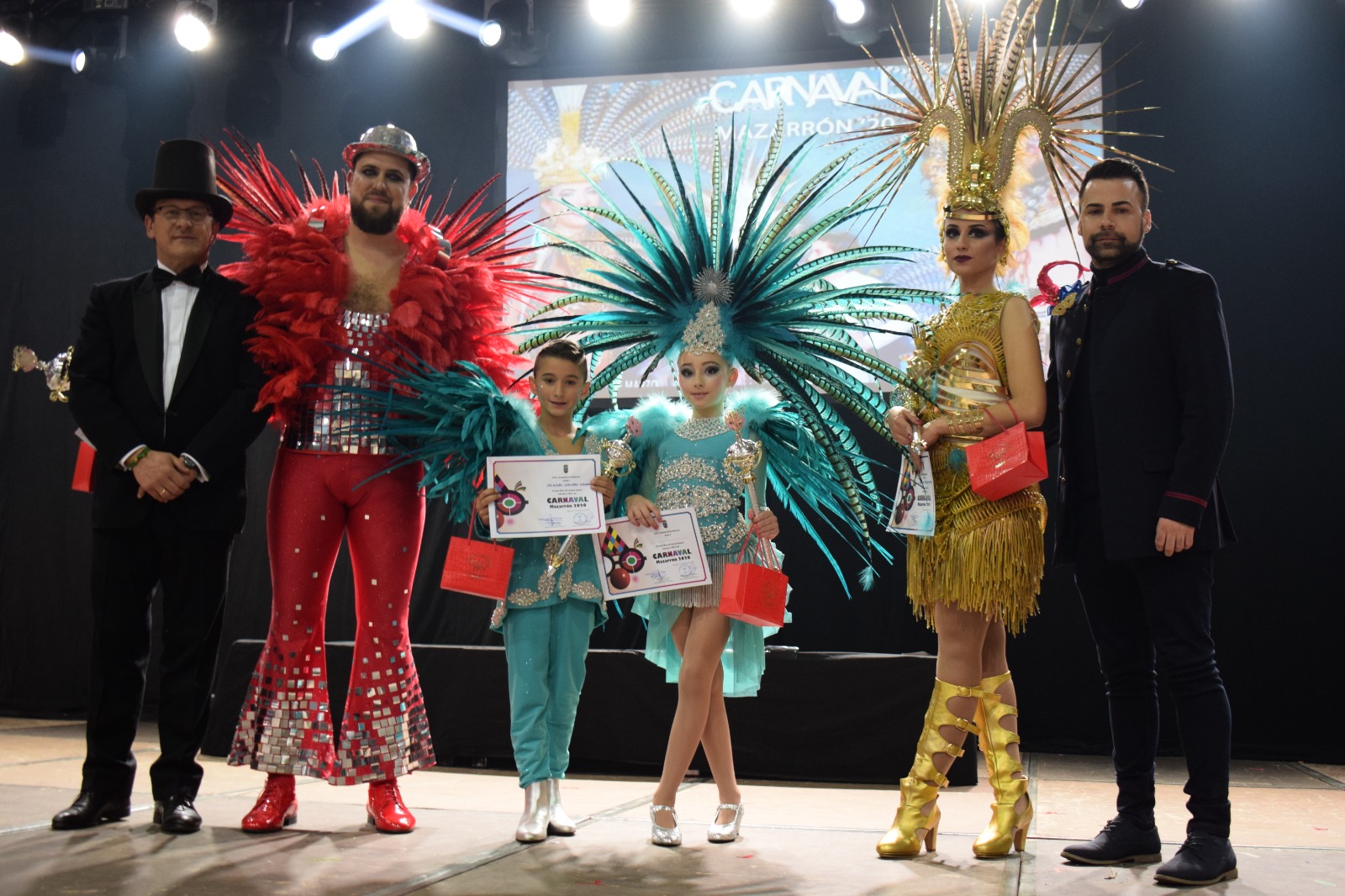 Maria José Morillas de Peña 'El Salitre' (Musa Juvenil), Juan Carlos López de 'Los Salaitos' (Muso Juvenil), Berenice Martínez de 'El Tolín' (Musa Infantil) y Luis Miguel Gallego de 'El Tolín' (Muso Infantil) recogieron anoche sus cetros como musas y musos del Caranaval 2020 de manos del alcalde de Mazarrón, Gaspar Miras, y el concejal de Festejos, Miguel Ángel Peña; durante la gala de Carnaval que llenó de baile y color el abarrotado pabellón de deportes de La Aceña.