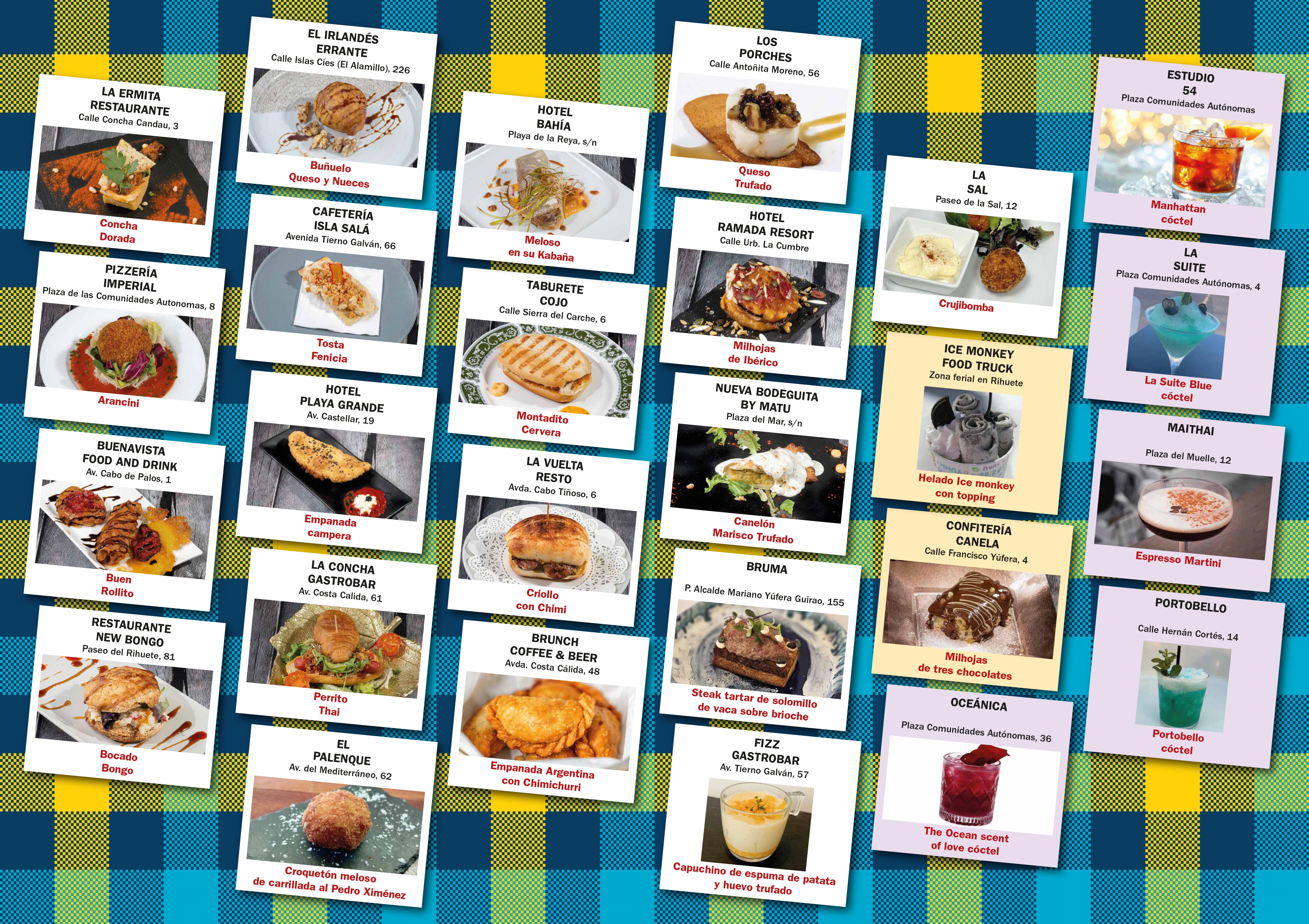 Tapas: La Ermita Restaurante con "Concha Dorada", Pizzería Imperial con "Arancini", Buenavista Food and Drink con "Buen Rollito", Restaurante New Bongo con "Bocado Bongo", El Irlandés Errante con "Buñuelo Queso y Nueces", Cafetería Isla Salá con "Fenicia", Hotel Playa Grande con "Empanada Campera", La Concha Gastrobar con "Perrito Thai", El Palenque con "Croquetón meloso de carrillada al Pedro Ximénez", Hotel Bahía con "Meloso en su Kabaña", Taburete Cojo con "Montadito Cervera", La Vuelta Resto con "Criollo con Chimo", Brunch Coffee & Beer con "Empanada Argentina con Chimichurri", Porches con "Queso Trufado", Hotel Ramada Resort con "Milhojas de Ibérico", Nueva Bodeguita by Matu con "Canelón Marisco Trufado", Bruma Restaurante con "Steak tartar de solomillo de vaca sobre brioche", Fizz Gastrobar con "Capuchino de espuma de patata y huevo trufado" y La Sal con "Crujibomba".