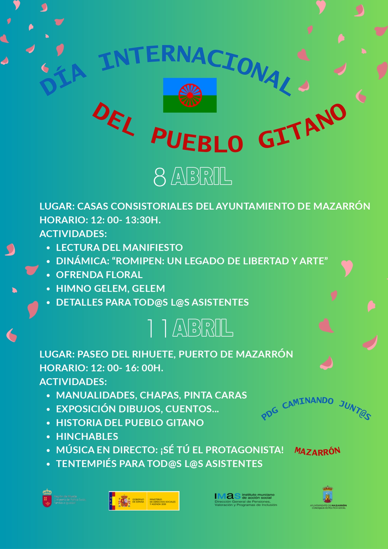 Las actividades continuarán el 11 de abril en el Paseo del Rihuete, en el Puerto de Mazarrón, de 12:00 a 16:00 horas, con una jornada más lúdica y abierta a toda la ciudadanía. Entre las propuestas destacan talleres de manualidades, chapas y pinta caras, una exposición de dibujos y cuentos, actividades sobre la historia del pueblo gitano, hinchables para los más pequeños y música en directo. También se ofrecerá un tentempié para los asistentes.