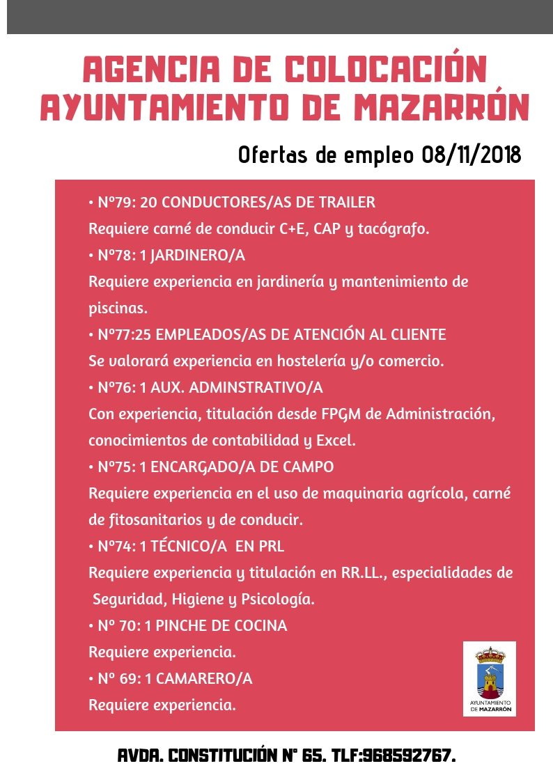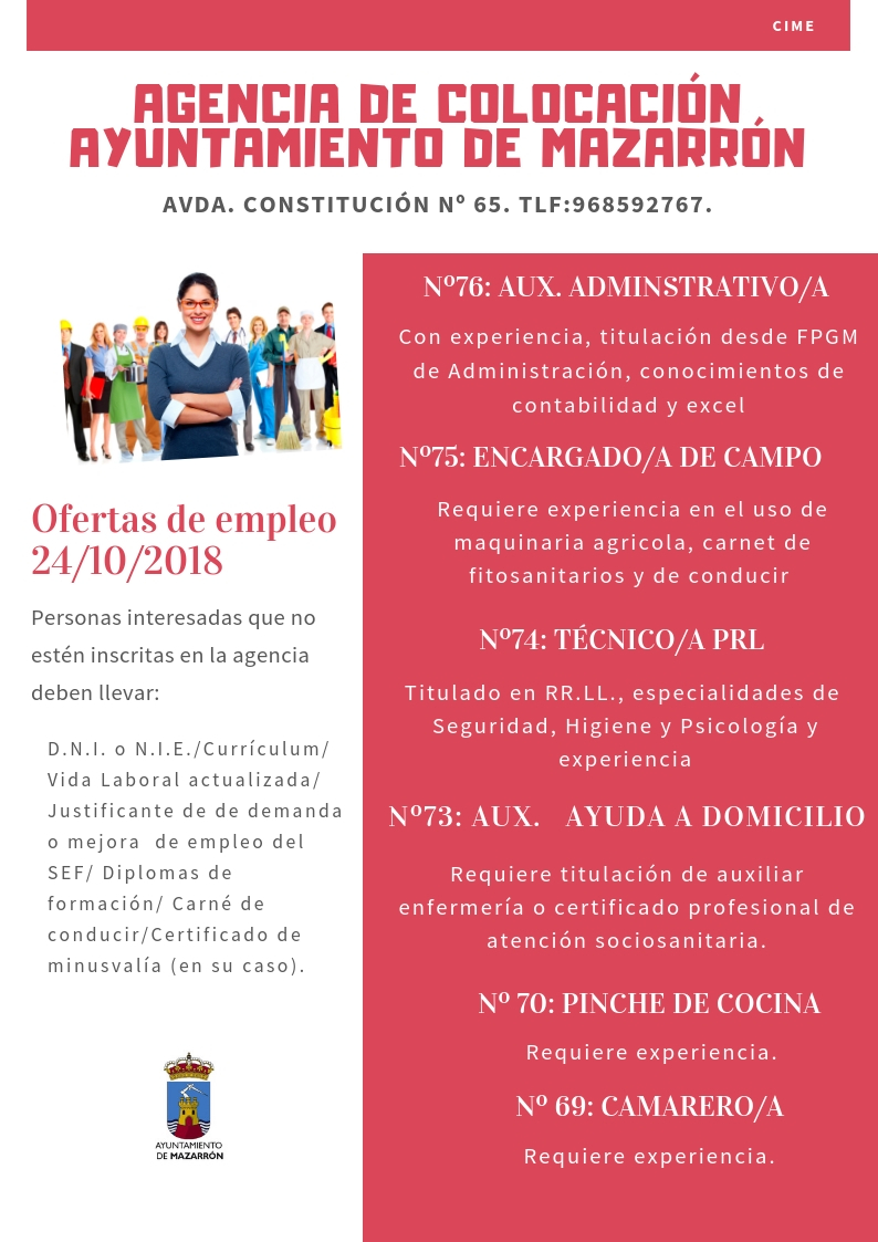 Las personas interesadas deben acudir al Centro de Iniciativas Municipales de Empleo (CIME) ubicado en la Avenida de la Constitución de Mazarrón