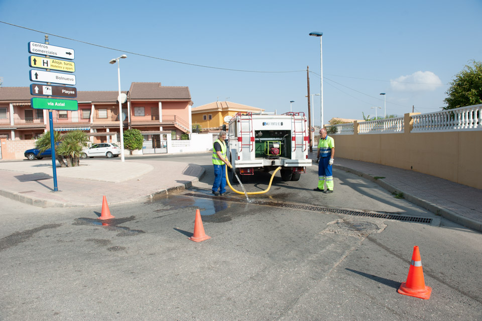 La Concejalía de Servicios del Ayuntamiento de Mazarrón lleva a cabo estos días la limpieza de imbornales y alcantarillados de las calles del municipio como medida preventiva ante una posible inundación con la llegada de las primeras lluvias de final de verano y principios de otoño. En concreto, los operarios municipales están incidiendo en puntos donde existe mayor riesgo de acumulación de agua. Trabajan en la Ordenación Bahía, Vía Axial y alrededores de la Plaza Toneleros y antigua Oficina de Turismo de Puerto de Mazarrón.