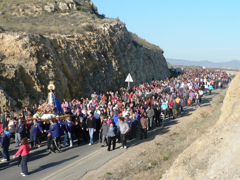 Unas 30.000 personas se dieron ayer cita en Bolnuevo para acompañar a La Purísima Concepción en el día grande de las “Fiestas del Milagro”, según las estimaciones realizadas por el cuerpo de la Policía Local. La popular romería que cada año se celebra como colofón a estos festejos congregó, no sólo a los vecinos del municipio, sino también a ciudadanos venidos de otras partes de la Región que quisieron convertirse en partícipes de esta celebración. Muchos de ellos realizaron los cinco kilómetros de recorrido que separan Mazarrón de Bolnuevo, una vez finalizada la misa en honor a la Virgen que tuvo lugar en el Santuario de La Purísima.