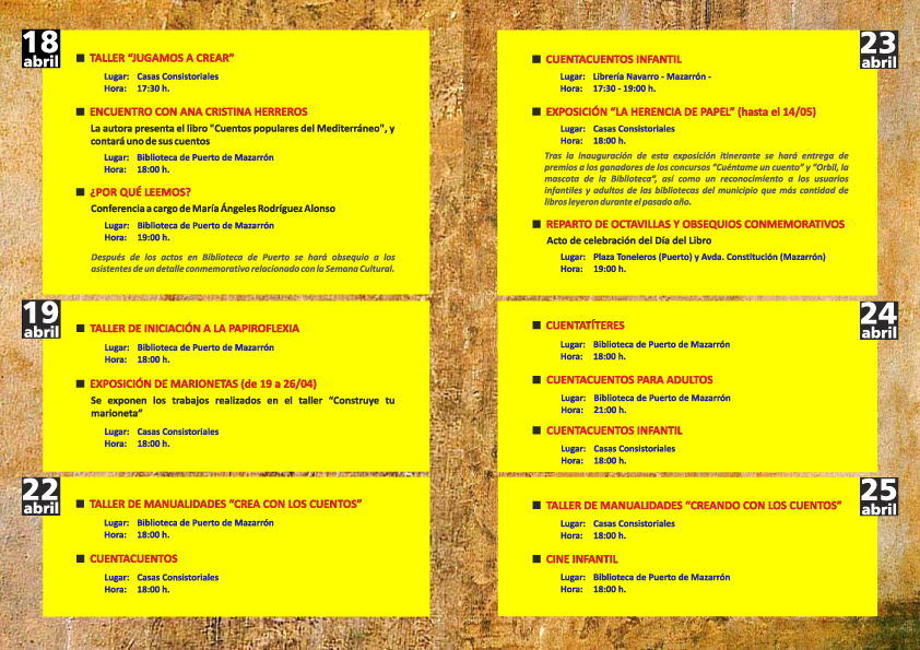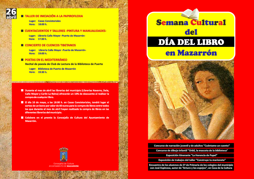 Cuentacuentos, cuentatíteres, recitales de poesía, talleres de manualidades y de iniciación a la papiroflexia, cine infantil e incluso un concierto de cuencos tibetanos componen la programación a desarrollar los días 19, 22, 23, 24, 25 y 26 de abril. Además, hay convocados dos concursos. Uno de dibujo para niños de entre 3 y 6 años, y uno de narración para jóvenes de 7 a 14 años, por un lado, y para adultos, por otro. Las bases de dichos concursos, que contemplan suculentos premios, pueden consultarse en la web municipal www.mazarron.es.