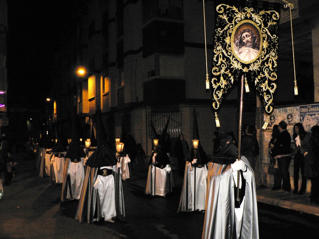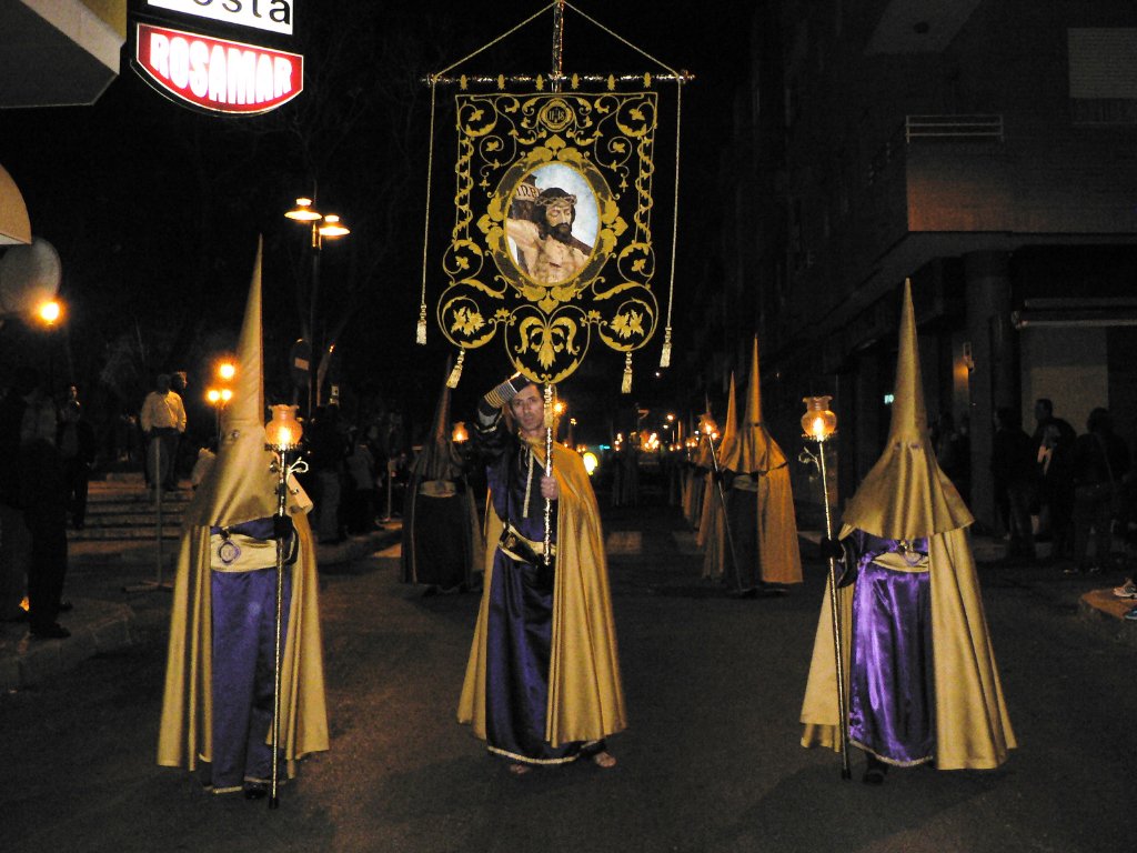 El cortejo lo abría el estandarte del Cabildo de Cofradías al que seguía la cofradía del Santo Sepulcro, que ayer sacaba dos pasos a la calle. En primer lugar, y con hábito totalmente encarnado, desfilaba La Flagelación, cuyo paso representa a Jesús atado a la columna y azotado por dos sayones. A continuación, con túnica encarnada pero con capa, capuz y fajín verde, desfilaba el paso de La Verónica, cuyo trono es portado solamente por mujeres. Ambos desfilaron con gran solemnidad y al ritmo de los tambores y cornetas que les acompañaban.