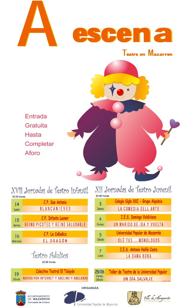 Hoy comienza en la Universidad Popular de Mazarrón una nueva edición de “A escena”. Este festival de teatro infantil, juvenil y adulto cuenta este año con una decena de actuaciones que se desarrollarán durante todo este mes de mayo. El “Grupo Alquimia” del colegio concertado “Siglo XXI” abre hoy las XII Jornadas de Teatro Juvenil con la puesta en escena, a partir de las 8 de la tarde, de “La Comedia Dell Arte”. Mañana viernes 4, a la misma hora, le toca el turno al I.E.S. “Domingo Valdivieso” que representará la obra “Un marido de ida y vuelta”.