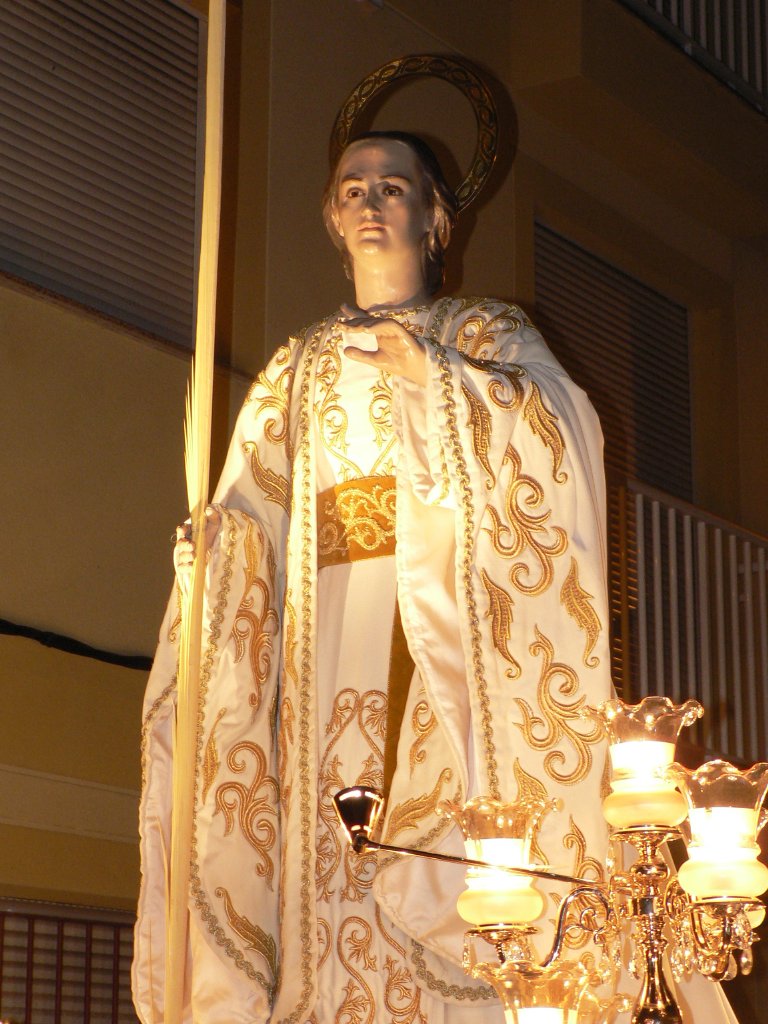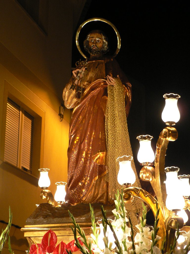 Abría el cortejo la Banda de Cornetas y Tambores de Puerto de Mazarrón, seguida de la cofradía de San Pedro cuyos componentes desfilaban con capuz, capa y fajín rojo y túnica blanca. La imagen de San Pedro, que portaba en sus manos las llaves del cielo y una red de pescador, iba acompañado del gallo que cantó una vez que el apóstol negó a Jesús en tres ocasiones. El trono de San Pedro, llevado a hombros con gran maestría por los portapasos, iba bellamente adornado con gladiolos blancos y claveles rojos.