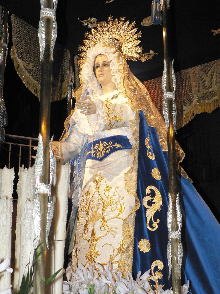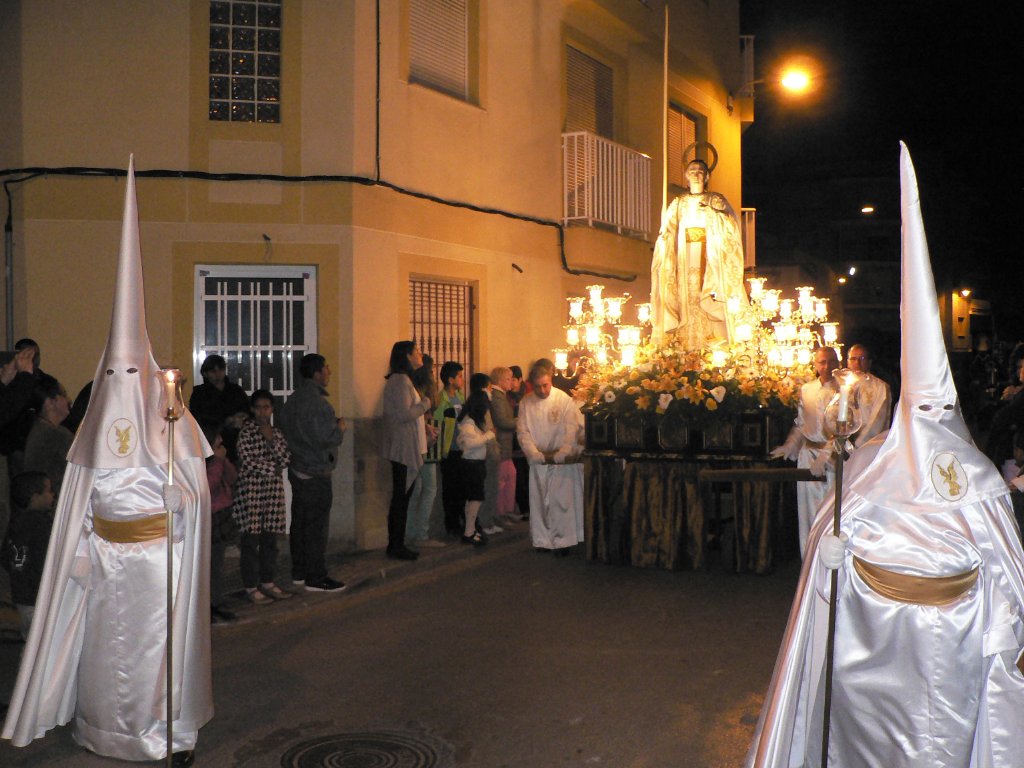 Totalmente de blanco pero con fajín amarillo desfilaban los componentes de la cofradía de San Juan. La imagen del apóstol más querido de Jesús iba sobre un trono engalanado de flores blancas y en tonos anaranjados. A éste le seguía la cofradía de la Virgen de Las Penas, cuya titular es la única virgen de la Semana Santa del municipio que desfila bajo palio. Los cofrades lucían también de blanco pero, en esta ocasión, con túnica azul. Los portapasos arrancaban los aplausos de los presentes al levantar sobre sus brazos el trono de esta Virgen.