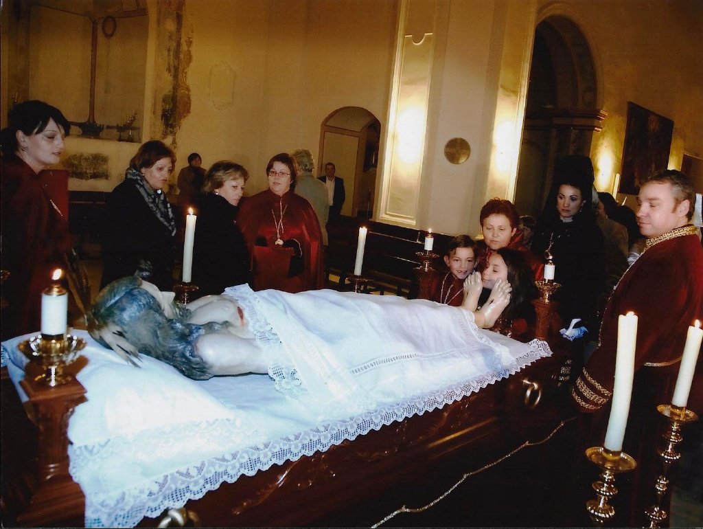 Cuando el Cristo yacente llega a la puerta de la citada parroquia, los cofrades lo retiran de su cuna dorada y lo colocan en una nueva sepultura cubriéndolo con una sábana y ante la atenta imagen de su madre, que se arrodilla en muestra de dolor y veneración hacia su hijo. Jesús es entonces colocado en el altar de la iglesia para que los vecinos vayan desfilando delante de él y besándole sus pies.