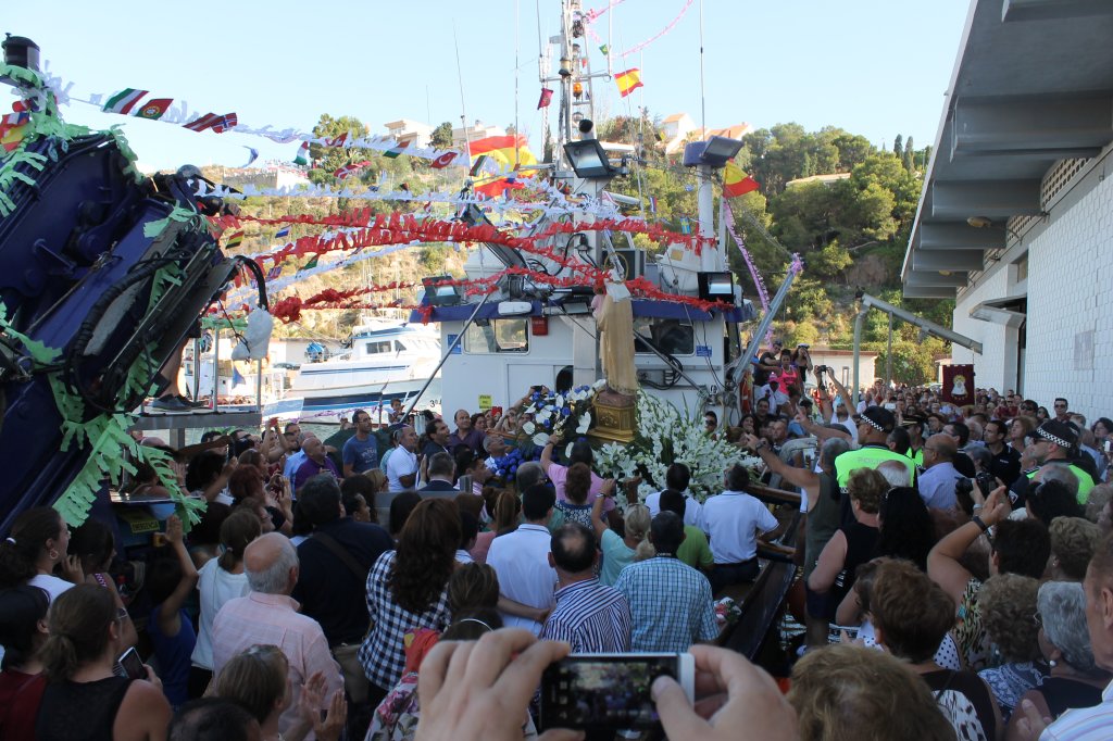 Una vez finalizada la misa, la imagen de la virgen se embarcó, al son de los tambores de la banda de la Cofradía Virgen de las Penas, en el barco “Paredes García”, embarcación que este año fue la encargada de llevar hasta la Virgen del Carmen hasta Bolnuevo. Allí se llevó a cabo el tradicional homenaje en memoria de los pescadores fallecidos el último año, lanzando los fieles sobre las aguas ramos de flores en recuerdo de ellos y del resto de pecadores y marineros fallecidos. Una veintena de grandes y pequeños barcos, engalanados para la ocasión, realizaron dicho recorrido para acompañar a la Virgen.
