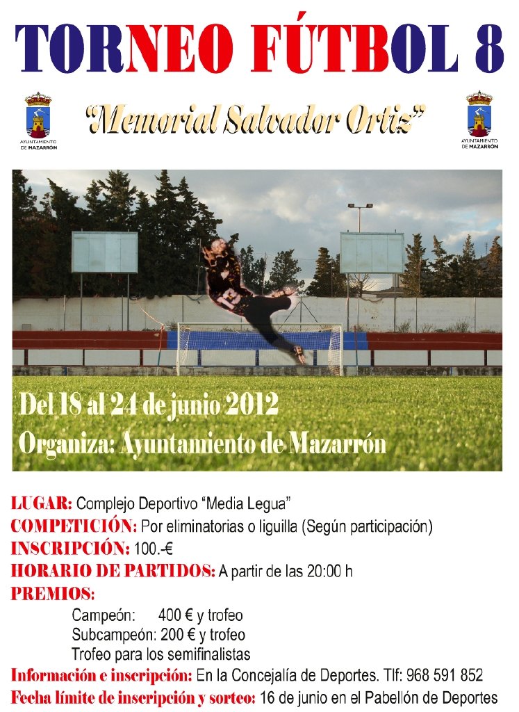 Hoy comienza en las instalaciones del complejo deportivo de la Media Legua el torneo de fútbol “Memorial Salvador Ortiz” que este año se disputa en la modalidad de fútbol 8. El sorteo de este campeonato se realizó el pasado sábado y en él participan 7 equipos que han quedado encuadrados en dos grupos. En el grupo “A” se encuentran 4 conjuntos que son “Panadería Ives”, “Channel 21”, “Clínica Seres y Colesport” y “Senegal”; mientras que el grupo “B” está compuesto por 3 equipos que son “Privé y Erasmo”, “Automaza” y “Floristería Caty”.