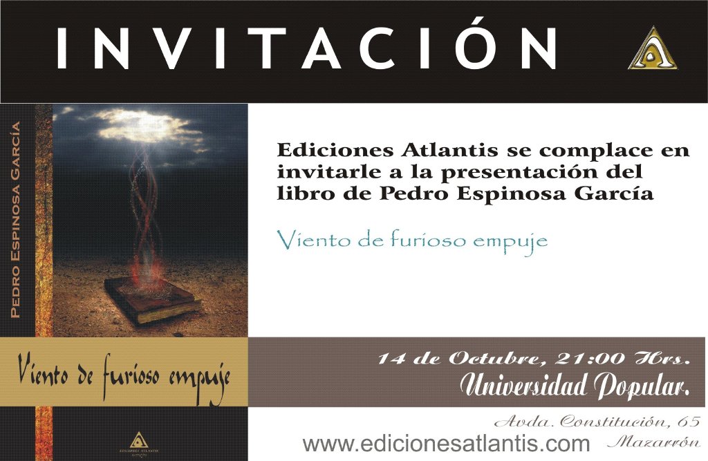 La Universidad Popular de Mazarrón (UPM) acoge este viernes la presentación de un nuevo libro. En esta ocasión se trata de la novela “Viento de Furioso Empuje” del escritor mazarronero Pedro Espinosa García. El acto tendrá lugar a partir de las 9 de la noche en el salón de actos de la UPM, situada en la Avenida de la Constitución de Mazarrón y contará con la presencia del Alcalde de Mazarrón, Ginés Campillo, y la concejala de Cultura, Educación y Turismo, María Celeste Soria.
