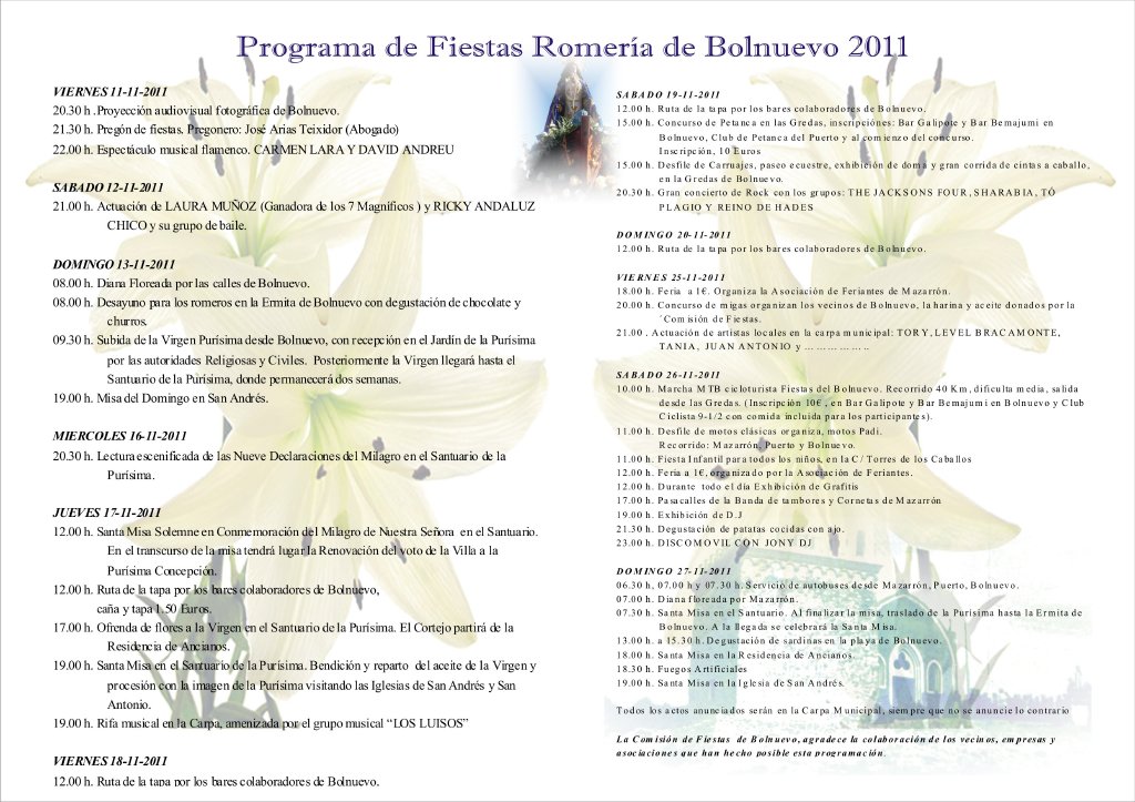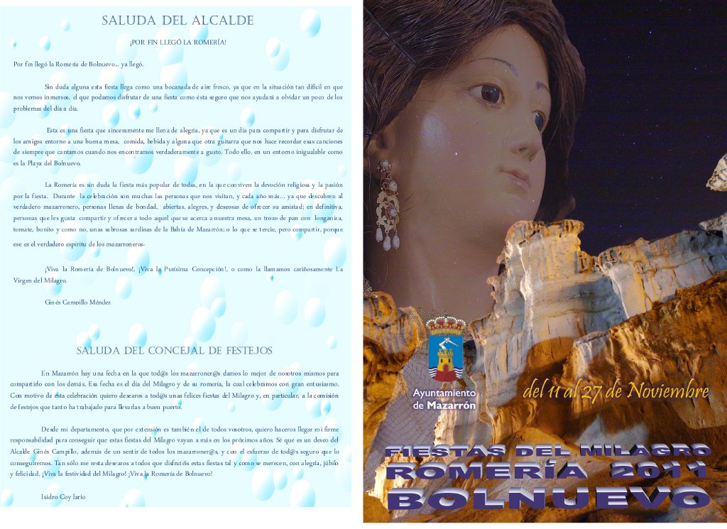 El Alcalde de Mazarrón, Ginés Campillo, ha invitado a todos los vecin@s a participar de estos festejos y ha felicitado a la comisión de fiestas por “la gran labor que han llevado a cabo para hacer de estas fiestas una cita destacada a nivel regional”. Esta comisión ha sido creada especialmente este año y en ella han participado la Asociación Cultural “Virgen del Milagro” y la Asociación de Vecinos de Bolnuevo, quienes han contado además con la ayuda de la Archicofradía de “La Purísima”. El concejal de Festejos, Isidro Coy, ha destacado que “este año estas fiestas se oirán más gracias a su elaborada programación y conseguiremos que se sepa que Bolnuevo está vivo durante todo el año”.