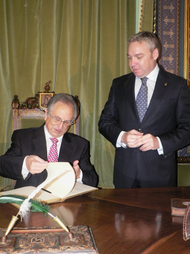 Antes del pregón, el empresario fue recibido en las Casas Consistoriales por el Alcalde de Mazarrón, Ginés Campillo, y el concejal de Festejos, Isidro Coy. Tomás Fuertes firmó en el libro de honor del Ayuntamiento tras conocer al resto del equipo de gobierno y a varios concejales de la oposición que le esperaban en el Salón de Plenos del emblemático inmueble. Al finalizar su firma se dirigió a los presentes destacando la juventud de la mayoría de la corporación, a los que dirigió algunos consejos “para que no interpongáis los intereses personales a las necesidades de Mazarrón”, haciendo un símil entre el municipio y su propia empresa. En este acto también estuvo presente el alcalde de Alhama de Murcia, Alfonso Fernando Cerón.